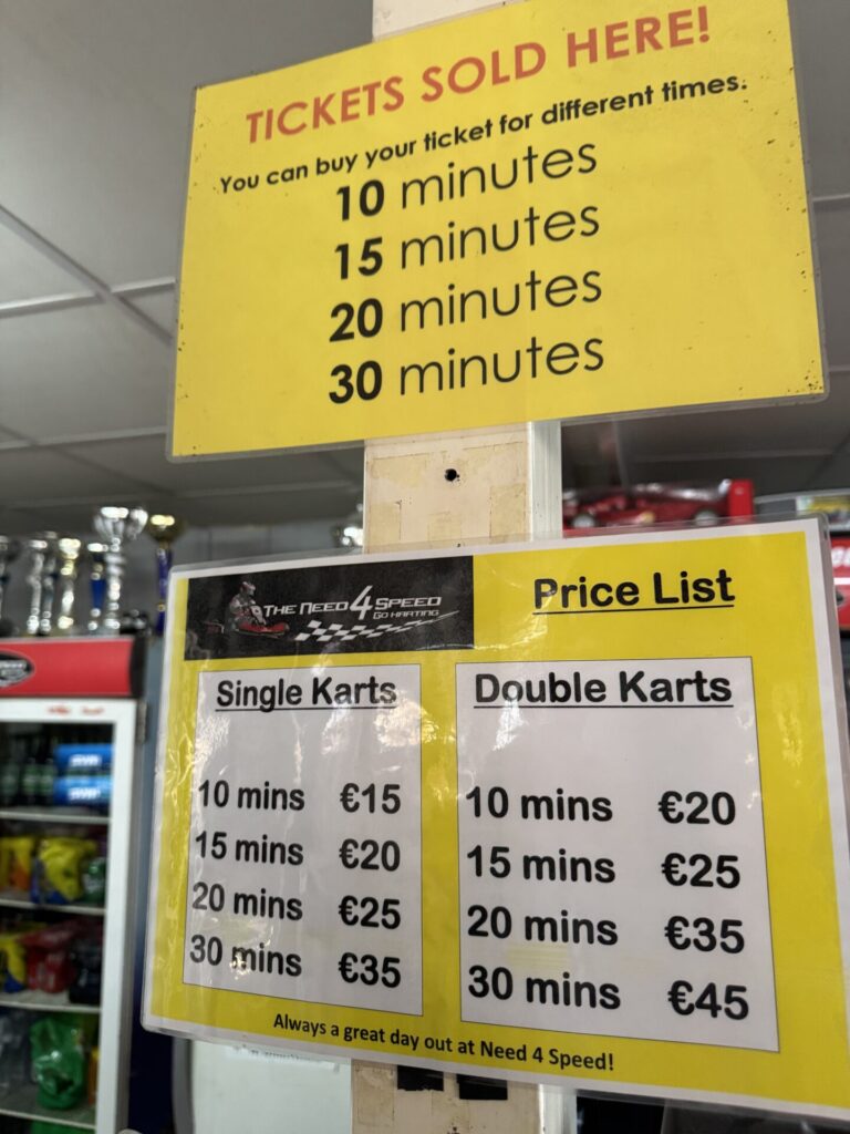 A double kart costs €20 for 10 minutes and €25 for 15 minutes.