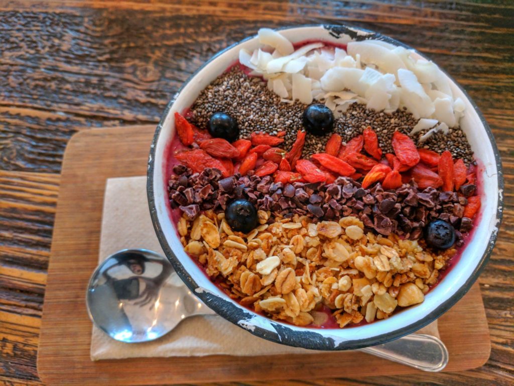 This is a bowl full of sticky rice with a rich selection of stir-fried vegetables and, above it all, chili sauce. The dish is large and very satisfying. I got a bowl with salmon and Roman chose pork and we were both satisfied. Great option for anyone looking for a different and tasty dinner. Mercosy. Directions