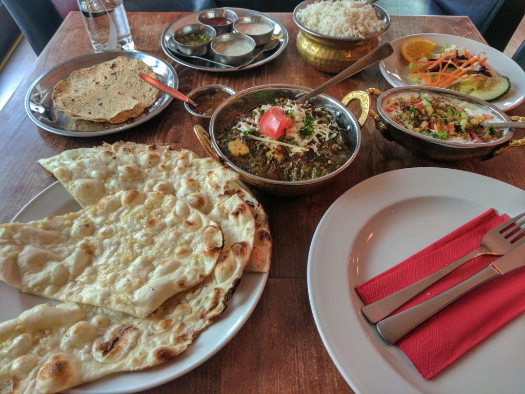 I ordered one of my favorite dishes Palak paneer which is a spinach stew with Indian cheese. In addition, I ordered naan (Indian flat bread in a pan) with garlic, rahita which is yogurt with tomatoes and cucumber that is delicious to eat with flak cheese on the naan and I ordered mango chutney sauce.