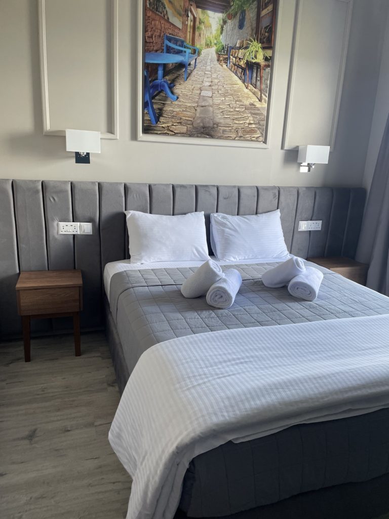 We booked an apartment, or in Israel’s terms, a Zimmer 🙂 in a charming apartment complex in the center of the village of Iosiphis Stonebuilt House. The complex has apartments with one or two bedrooms. We booked a two bedroom apartment because it is convenient for us and Maya to each have our own room. The price was cheap, 68 euros. And when we arrived it turned out that the whole complex was full for that weekend and it wasn’t even the peak of the season yet (so I recommend booking places in advance as early as possible). The apartment had a fully equipped kitchen (with a coffee machine and capsules and a pop-up toaster).