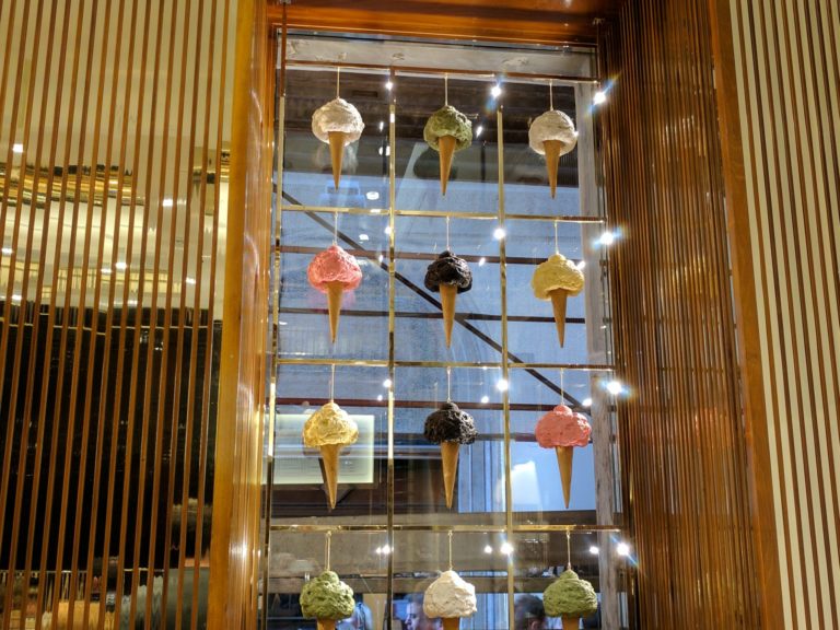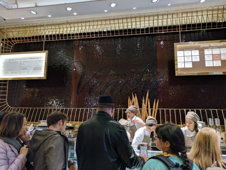 I tried the caramel flavour in a cone topped with chocolate and nuts. And Roman tried the mango and strawberry sorbet. They were so good and the Gelateria itself is really awesome. They have a chocolate waterfall wall. Wow.