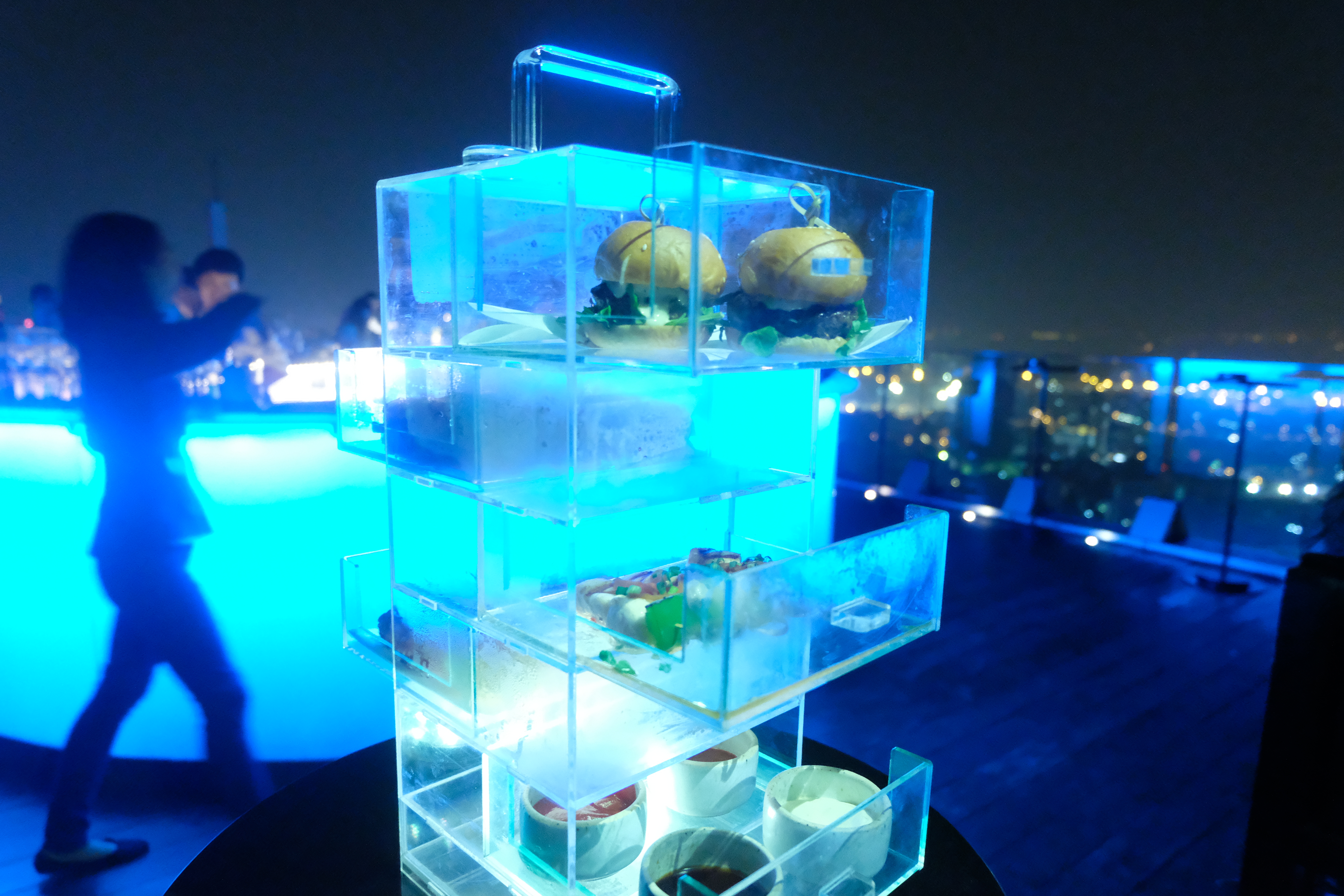 Also, they serve a bar meal for couples up to 21:00, for 1500 baht. The meal is served in a box with drawers, each containing something such as two mini-burgers, chicken nuggets and more. It was really delicious! We enjoyed the food and drink experience very much, as well as the prestigious atmosphere and beautiful view.