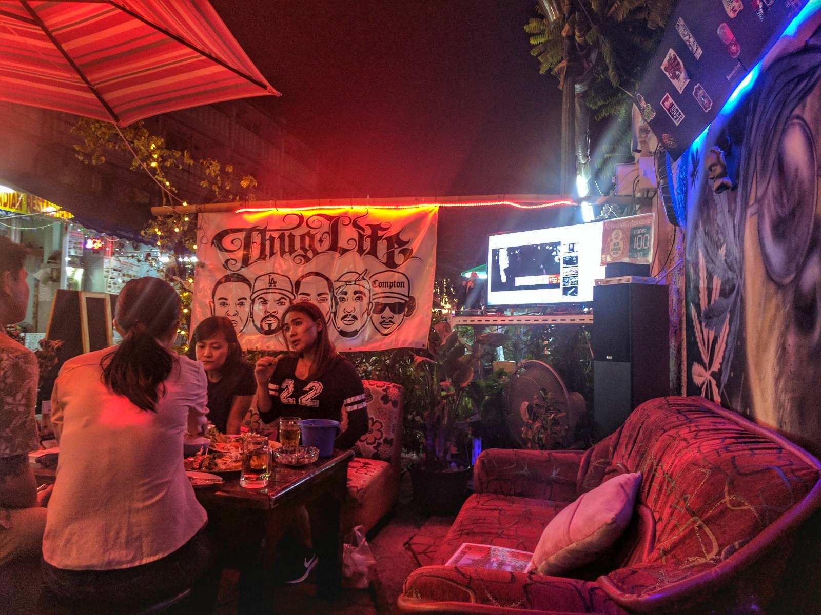 There was a small street bar with good African-American music, and the staff had a cool style we really liked, as well. The bar is Nhoom’s Bar, on Rambuttri street (Map).