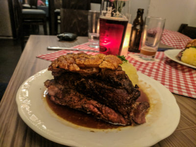 All the dishes were successful and tasty. I usually don’t like pork as much, but the dish was crunchy and well made. Despite that, Roman had obliterated most of the dish while I had more of the sausages. The cheese starter was unique, and I enjoyed the cheese’s seasoning. The sausage in vinegar was less to my tastes, but Roman liked it a lot. For dessert we had potato pancakes and fresh apple purée. The pancakes weren’t sweet, and Sarah told us they’re used for savory dishes with ham and eggs, as well. I really liked the apple purée, it was honestly a light, delicious dessert. We also ordered an amber beer and Roman had a dark beer.