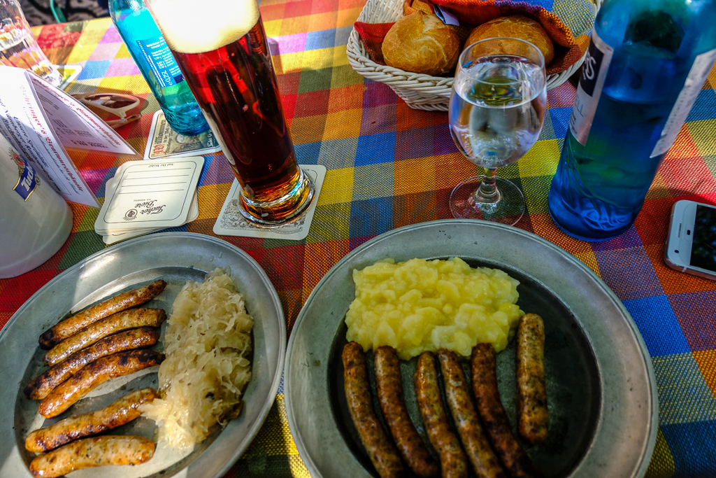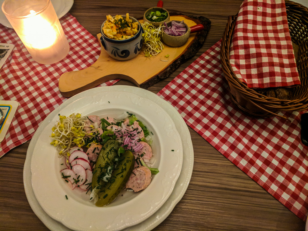 We asked Sarah to explain the menu to us a bit, and eventually decided on two starter dishes, two mains and a dessert. For starters we ordered spiced cheese, served with bread and both regular and spring onions and a sausage dish served in vinegar. For mains we ordered the flag dish, a pork shoulder (Slowly cooked) and a dish of Nuremberg sausages with a side of slaw and potato salad.