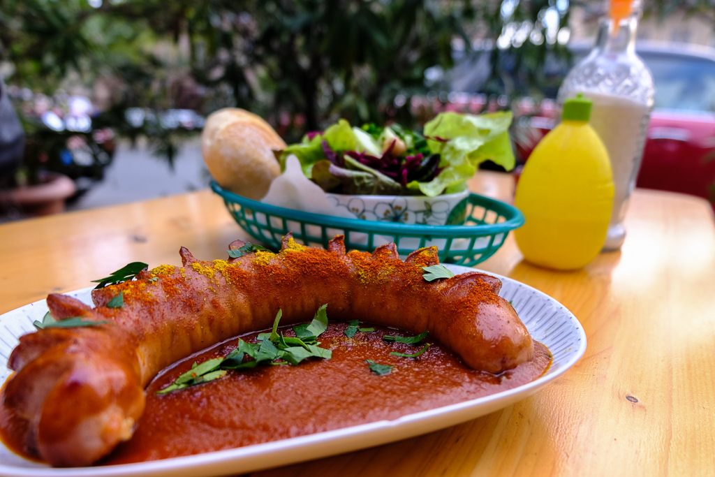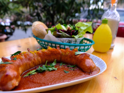 It was a bit chilly, so I decided to get a ginger, lemon and honey tea and Roman had bubbling pear juice. We also ordered Currywurst. (I’ve had enough sausage in Nuremberg to last me for the next couple of months). The dish came with a tasty salad and a bun.