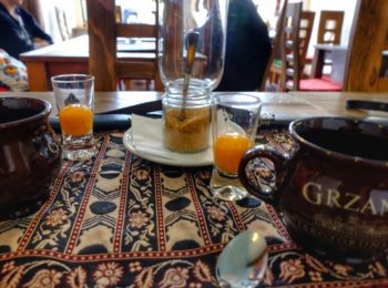 We went to the first bar-restaurant and sat by a large table. Piotr pulled out all sorts of accessories from the days of the nobility, when they used to drink hot beer for breakfast, to set the right atmosphere. And that’s how we started the tour, with hot beer. At first we got small cups of egg yolk and a glass of sugar. Piotr guided me and told me to pour the eggs and sugar into my beer glass and stir well. At one point, we were served a pitcher of hot beer and had to pour it slowly into the glass while stirring. It’s hard to say if I liked the beer or not. It was definitely different from all the other beers I’ve tried. You can’t find this beer on menus at bars or restaurants, they made it especially for us, since Piotr works with them on his tours.