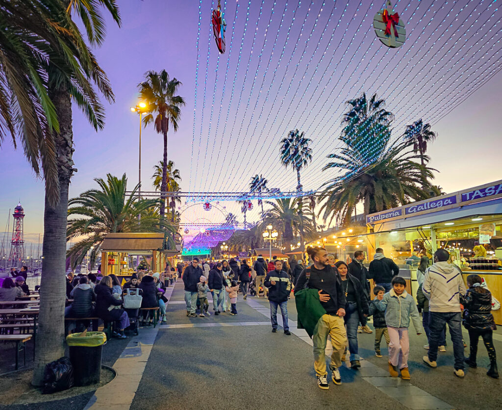 Located next to the Columbus Monument and the Maremagnum shopping centre, although it is smaller than typical Central European markets, it is the setting that makes it unique, with glowing Christmas lights against the backdrop of the endless blue sea. It is at its most beautiful at sunset, when the sky turns pink above the yachts, the perfect time for photos.