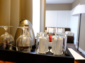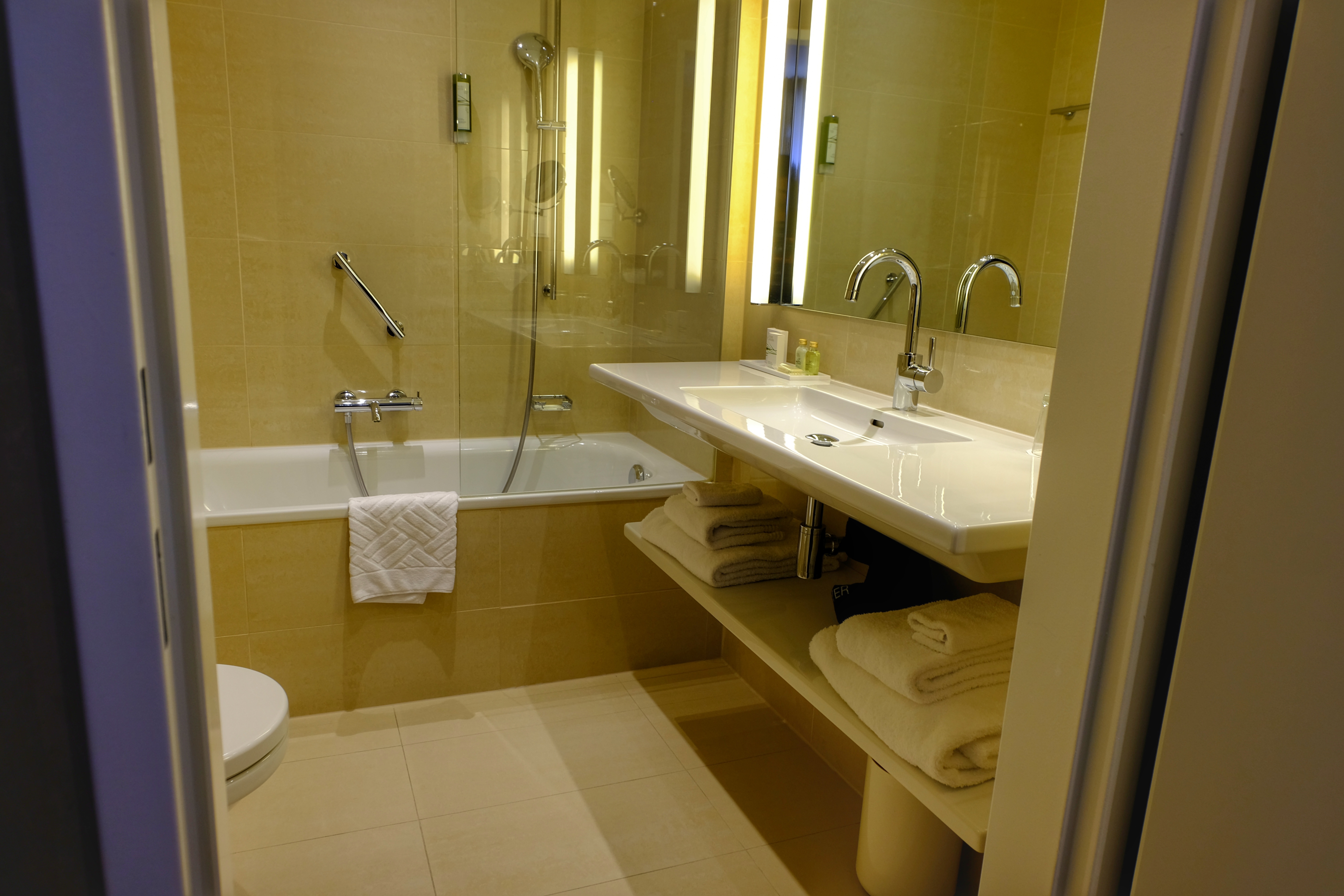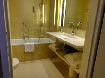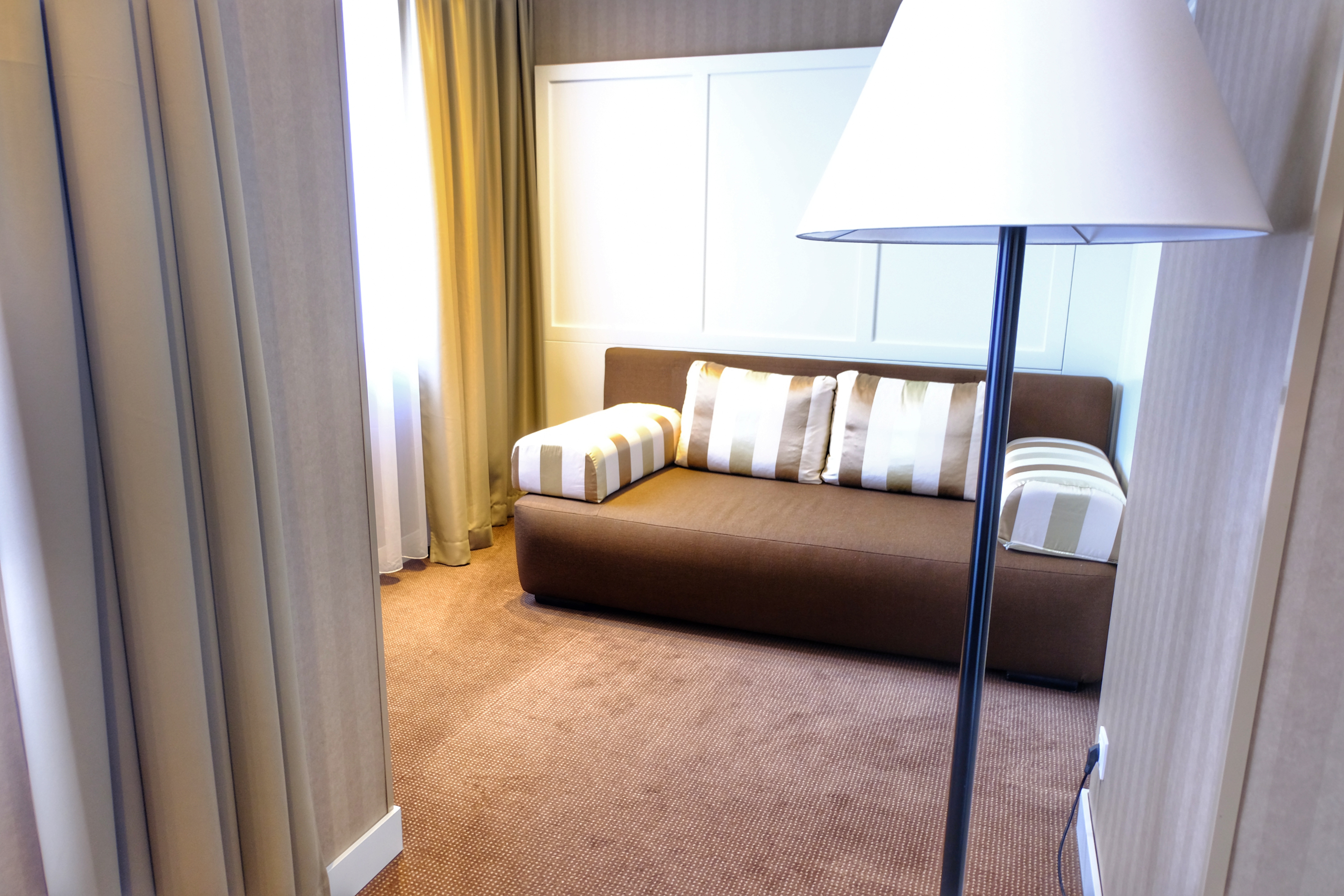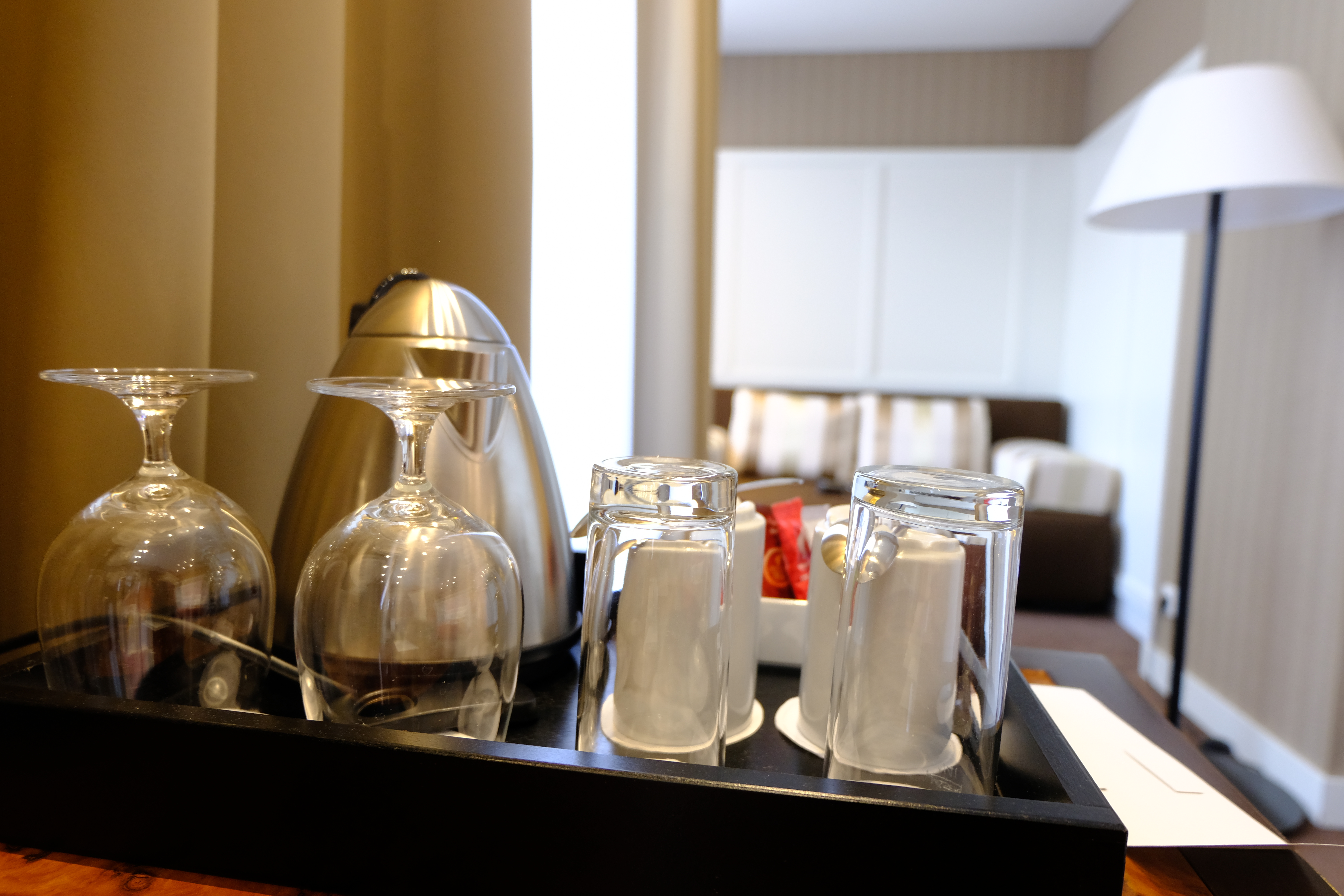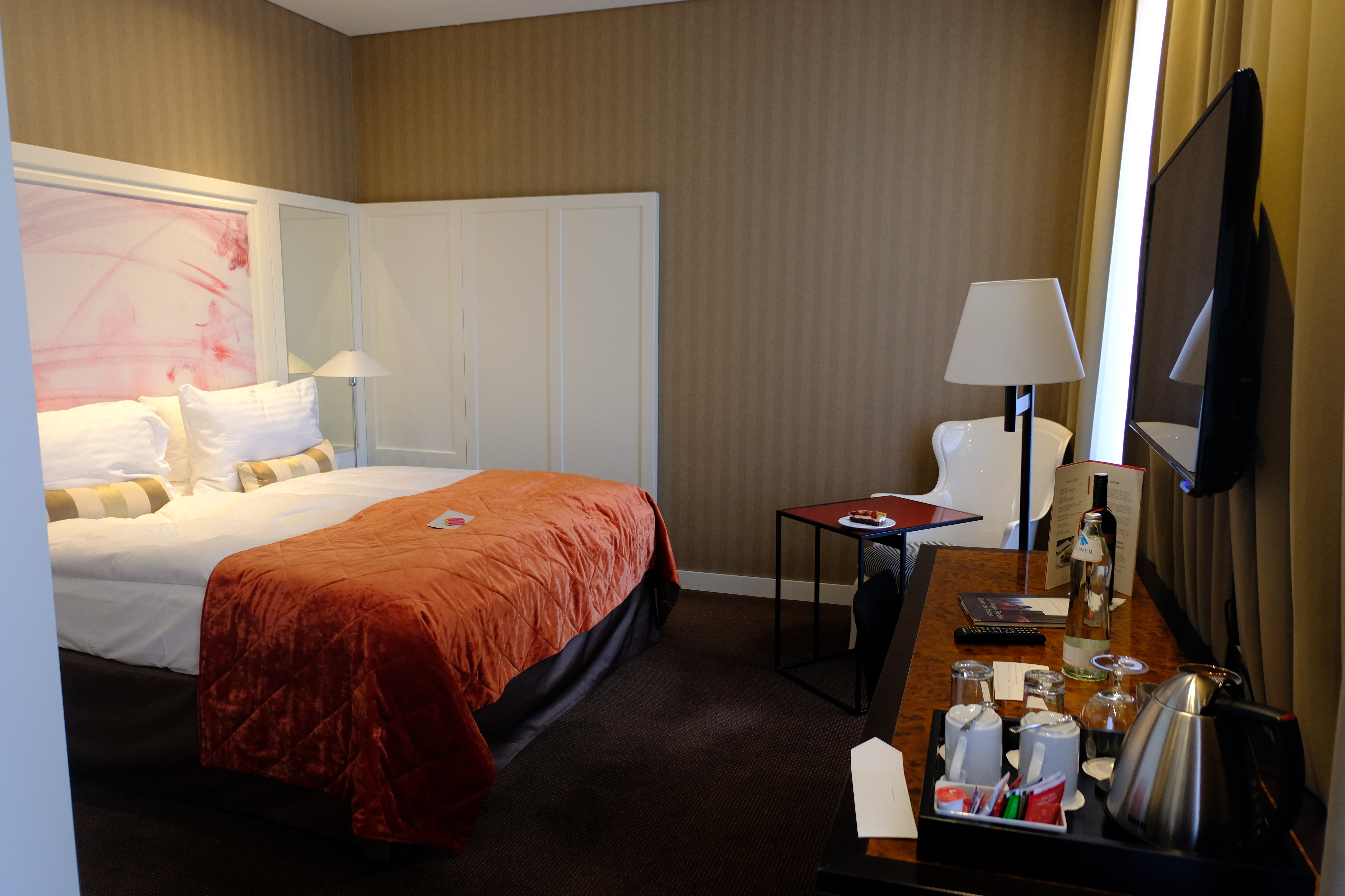 We got the upgraded room, which was large and spacious – with a bathroom, a sofa, and bed with a small writing desk by it, a dresser with a mini bar, a kettle and tea set and a TV.