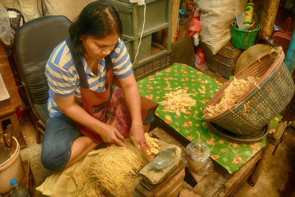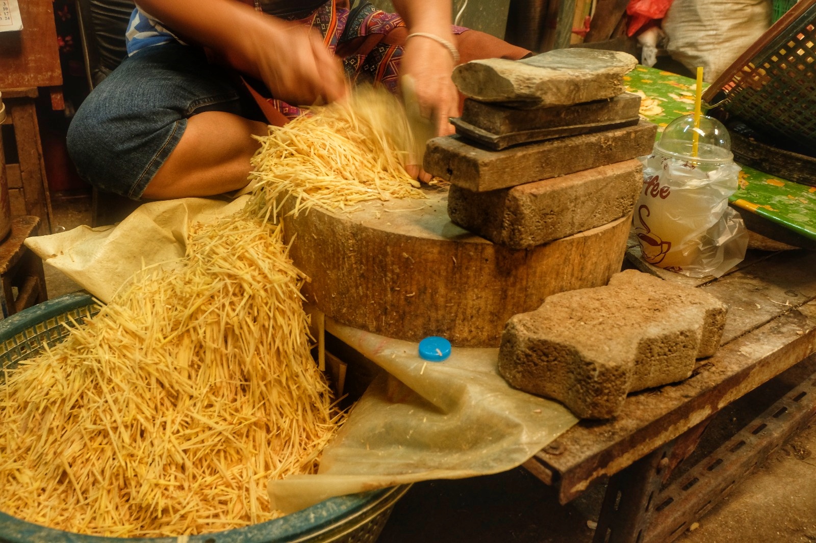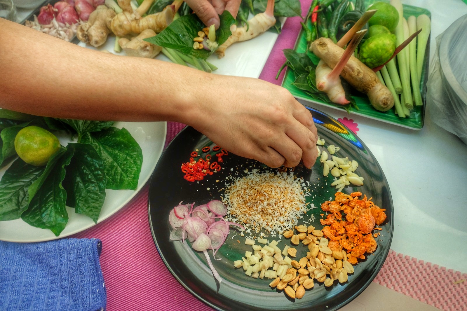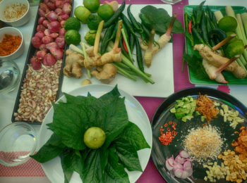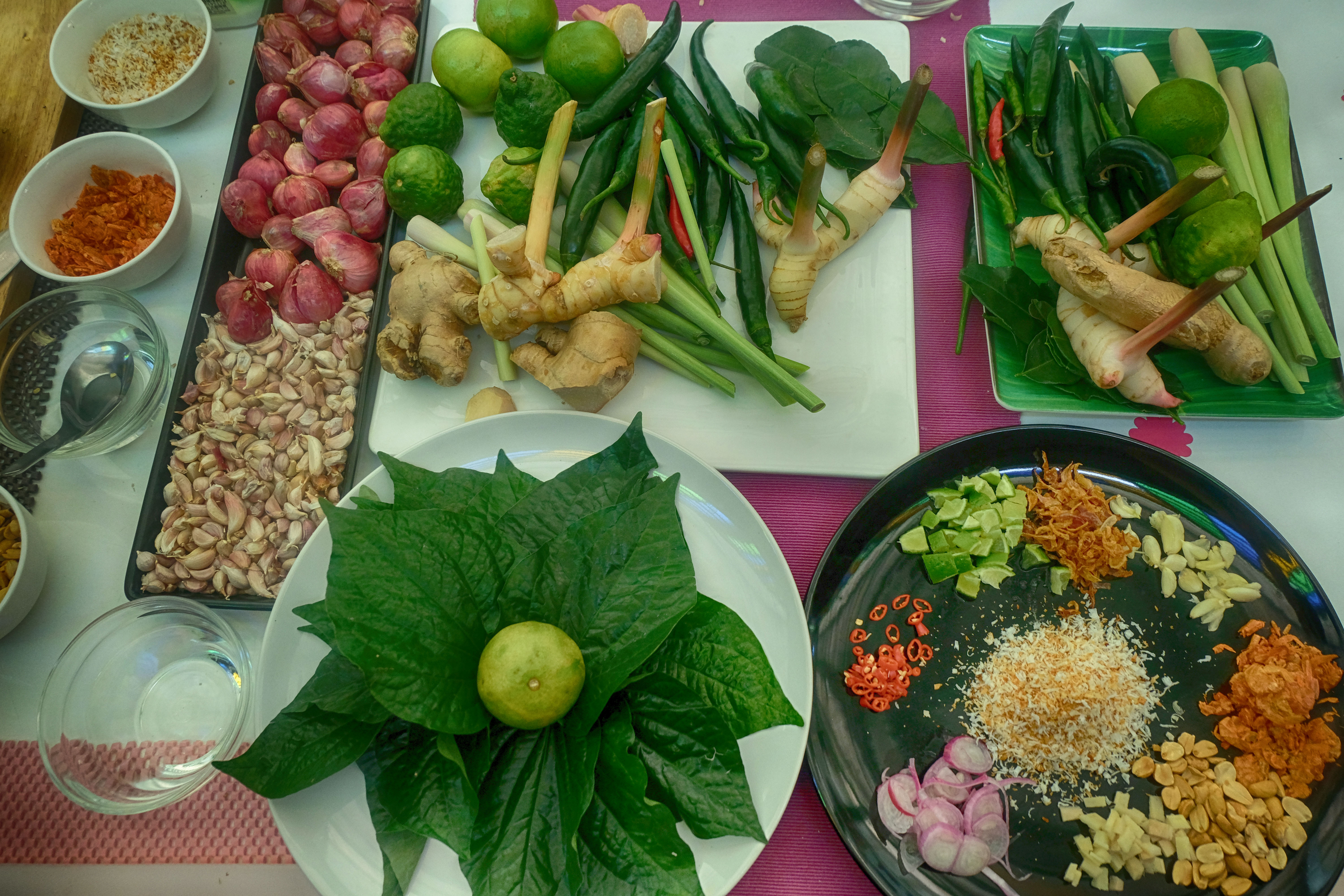 For starters, we prepared an appetizer called Miang Kham, to start the morning off with something tasty. The process took place outside of the room, where we had a view of the market. We met the other instructor, Alyssa, who’s also a professional chef and had spent several years working in Europe. Both Tam and she were really nice and spoke excellent English Alissa gave each of us cutting and cooking jobs to prepare the dish.