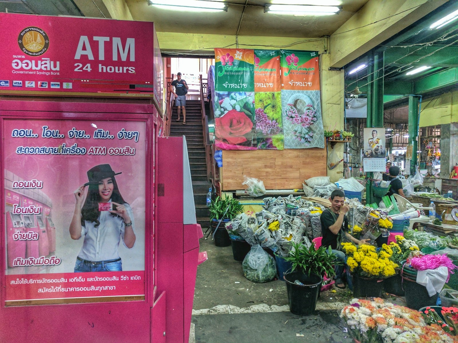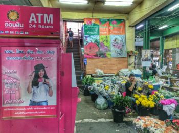 You arrive at the Pak Khlong Talat flower market and go in. About half way through, you’ll see a pink ATM next to a flight of stairs. You go up those, there you’ll find a sign pointing the way to the cooking class.