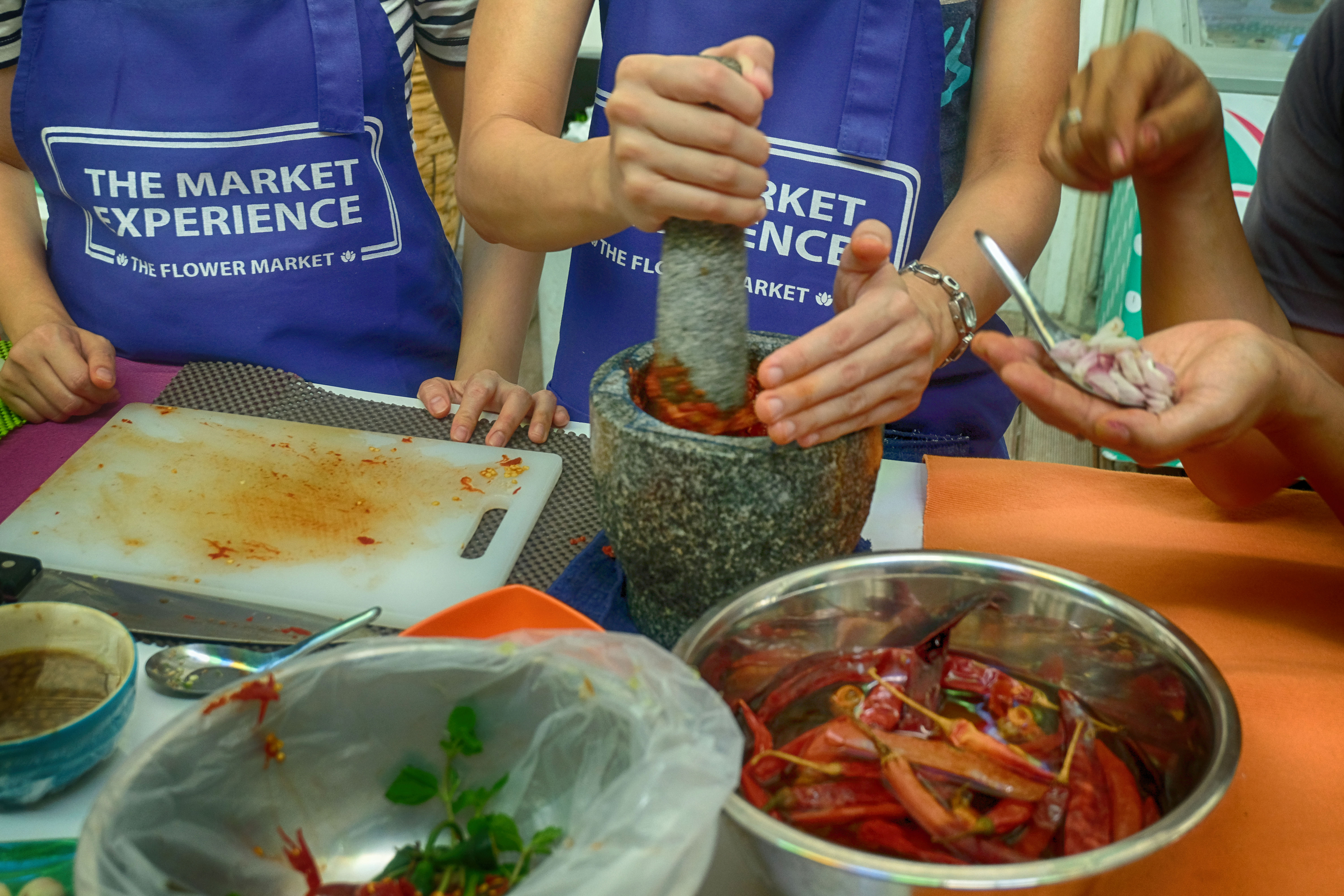 We arrived at class and met one of the instructors, Tam, who is a professional chef who’s worked in Australia for 10 years. Tam told us a bit about the class and the market’s history. The flower market has a long history, it used to be a floating market, then became a fish market and was later converted into today’s produce market, selling fruit, vegetables and more for over 60 years.