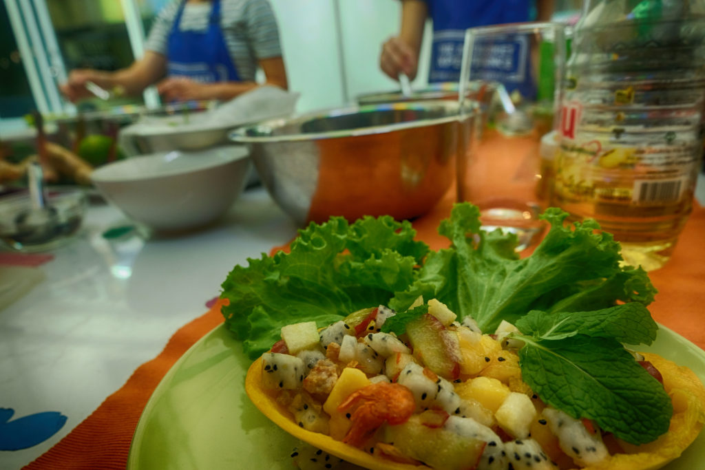 For the second dish we made a fruit salad with a twist. We cut many fruits and put them in a bowl, then made ground pork cooked with garlic and mixed it in. I know it sounds a bit odd, but it was very good. The sweet and salty flavors complimented each other. If you have certain food intolerances or foods you avoid, it’s no problem to notify the chefs when booking the class and they’ll accommodate accordingly. When the fruit salad was done, we placed it in an Pineapple shell and ate it.