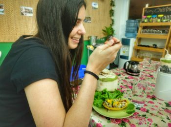 After making the appetizer we went for a tour of the market with Alyssa. She gave us a tour of the food portion of the market. While the market is wholesale and sells to hotels, restaurants and more – tourists can shop there as well. Alissa told us more about the ingredients we saw and bought a few of them for the cooking class. During the tour, we came across a stall selling “butterfly tea”, so Roman and I bought some to bring back to Israel with us, as did the girls from Singapore. The tour lasted an overall of about 30 minutes, then we went back to the lesson.