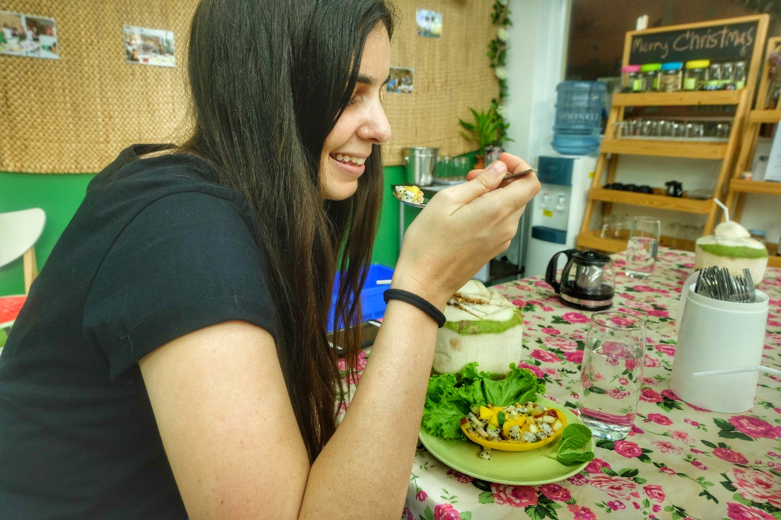 She told us about the ingredients and offered possible replacements for the ones we don’t have back home. The appetizer was a mix of flavors – sweet, bitter, salty and sour. We put all the different ingredients on a leaf of lettuce, dipped them in a sauce we made and ate them in a single bite.