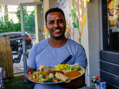 There, we drank cold Hibiscus tea and ate Injera (Eritrean bread made from teff flour and considered a super food). The Injera is very large and a type of flat, airy sour bread, made in a round shape with different Eritrean stews and Israeli salad on top of it (A twist added in Israel :)). What’s fun about it is that everyone shares it and eats with their hands. This dish I already knew and it’s one of my favorites, but it was my first time at this restaurant which was very good. The dish is vegan and gluten free, but they also serve meat.
