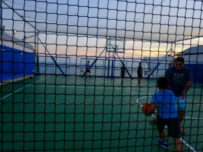 As soon as we boarded the ship, we were stunned by its size and beauty. At the check-in station we were given a map to the ship, and there’s a reason for it. If the ship seemed big from the outside, from inside it felt even bigger. We went for a walk around the ship to get a sense for all it had to offer. We discovered bars, restaurants, a casino, a pool, an adult only area with two jacuzzies, a gym, a kids playing area, a video game area, a spa, a duty-free, a basketball court and more. Afterwards, we went to eat at the buffet. At one point, it was announced over the speakers and the rooms were ready (Around 15:00), so we went to our room.