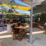 A dining area with a nice playground outside. There you will find a pizzeria, a hamburger place (which also has salads), sushi, a cafe, and a bar.