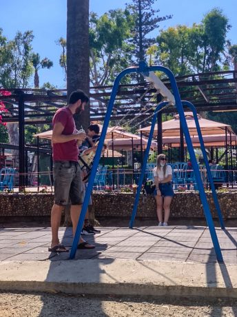 The whole boardwalk is nice but the Molos area (directions) in my opinion is the most fun. It has a lot of cafes and a very wide section of sidewalk and lawns. It also has beautiful sculptures and a playground. There’s parking next to it, which you need to pay for in the parking machines (on Sundays and holidays it is free).