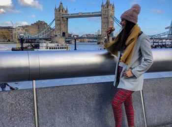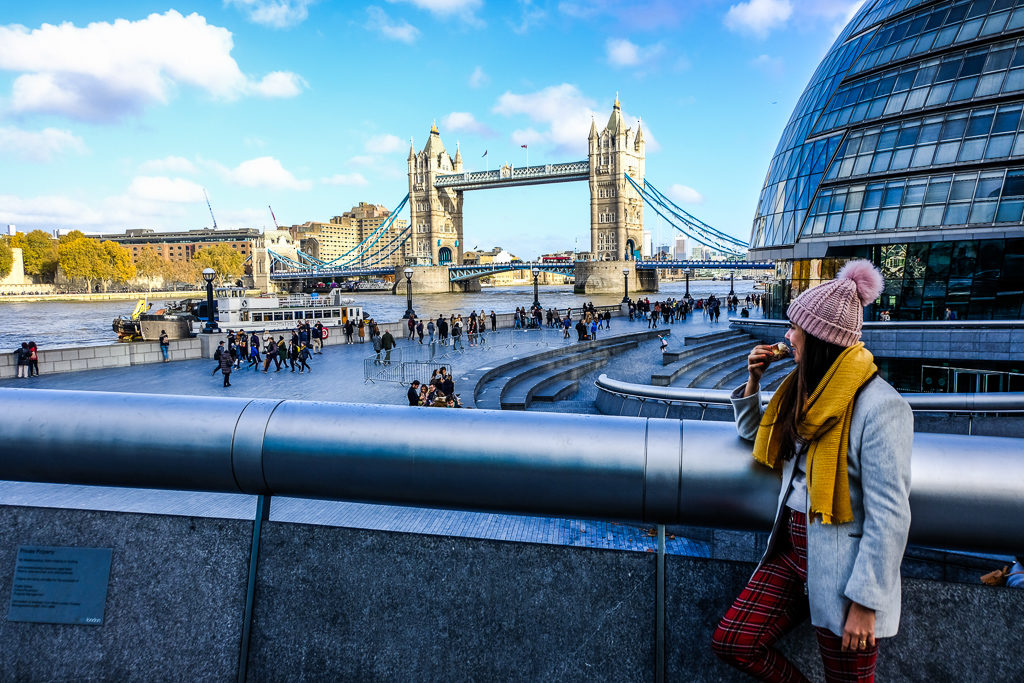 We then continued to one of the prettiest places in town. A vantage point overlooking Tower Bridge, with gorgeous blue skies which meant we could take some beautiful photos. Lucy brought us a final surprise – one of the donuts from the market which she claimed were the best. I’m not a huge donut fan, but I did use it as a prop for taking pictures in front of the bridge 🙂