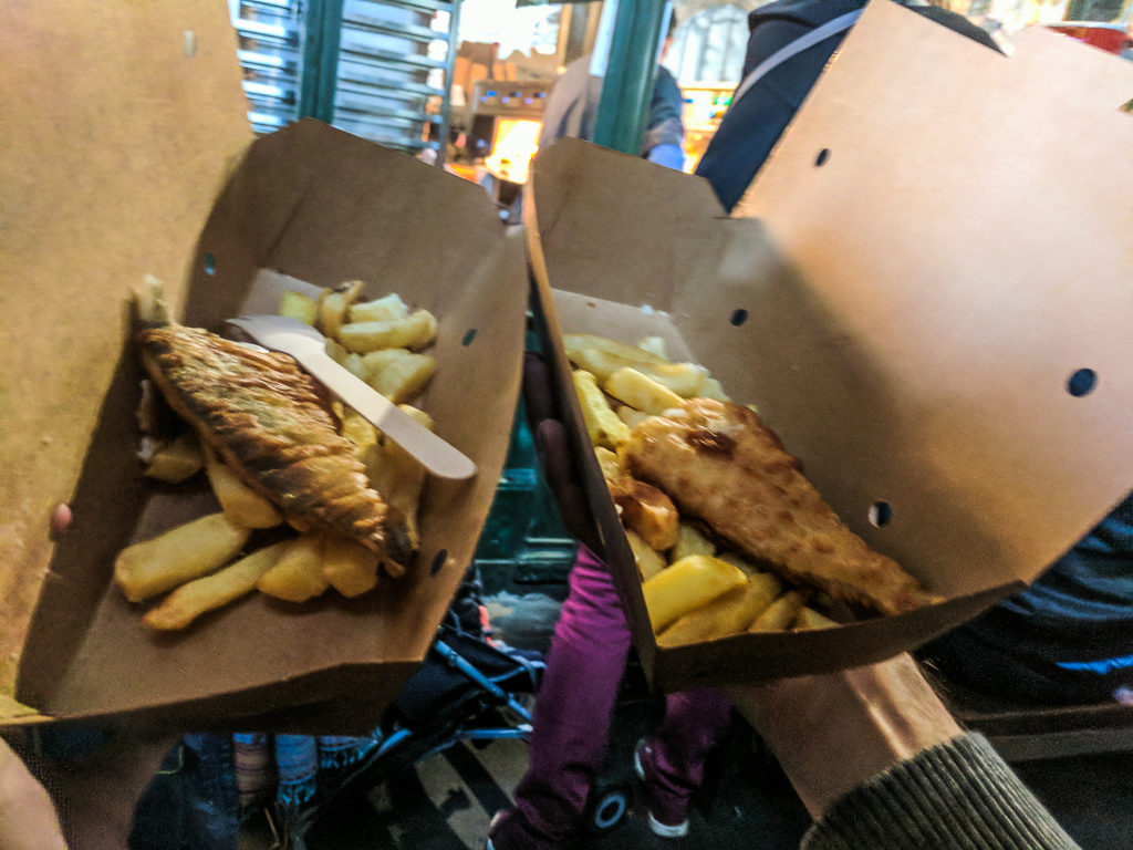 After the break we had Fish & chips at a prize-winning stall, and they were truly delicious (Haddock in a beer batter and triple cooked chips). The place doesn’t exactly have seating, but at some point, a bench opened up and we managed to cram a few people onto it.