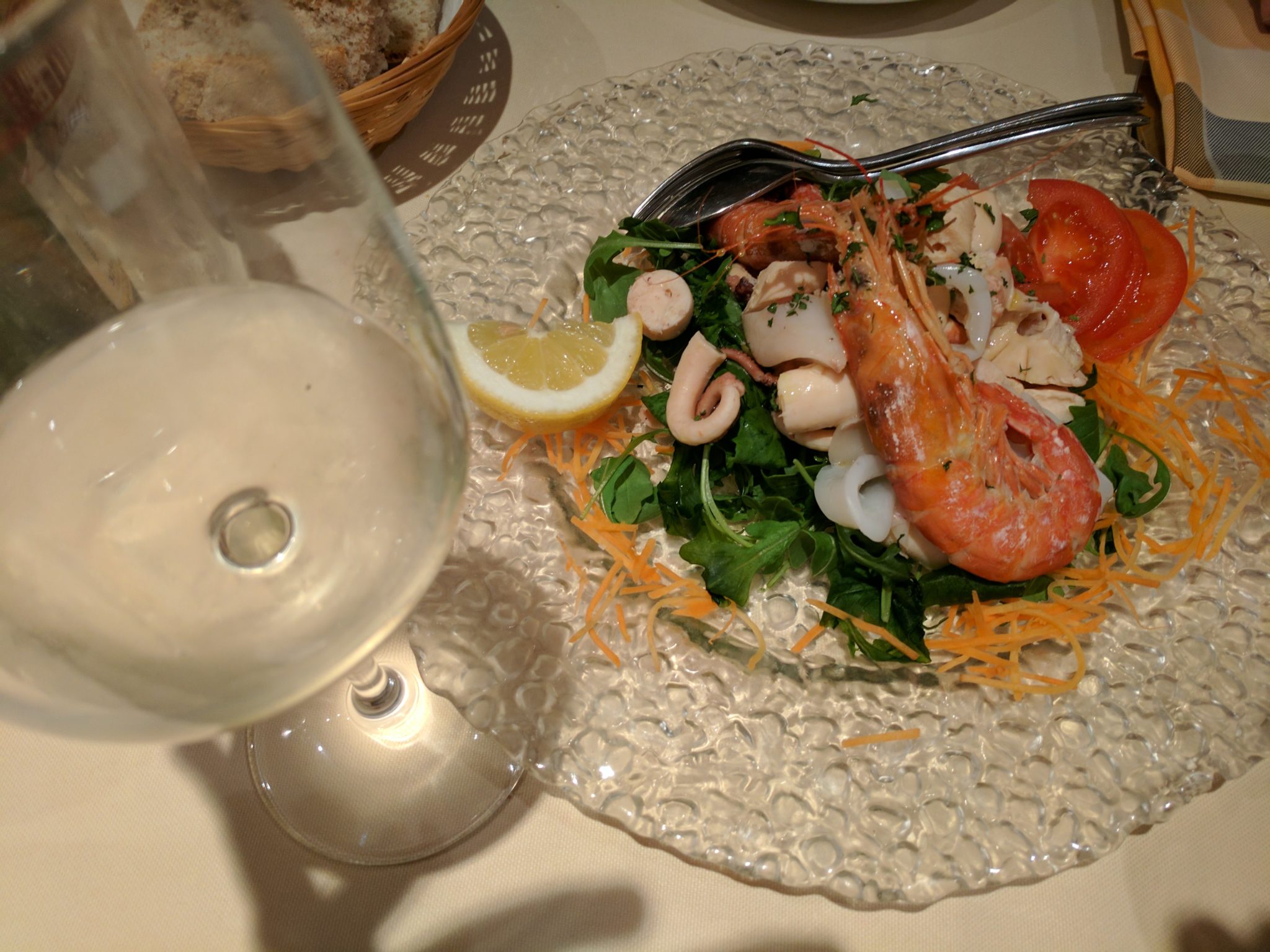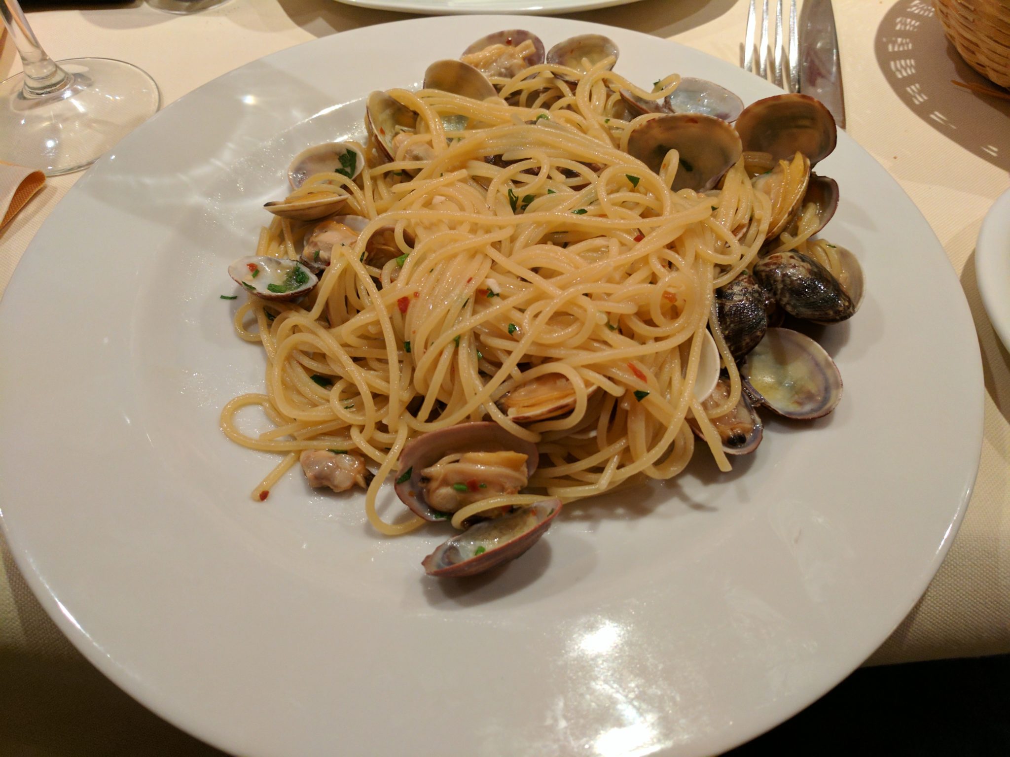 The prices are low and the food is great. For a starter, we ordered a fresh calamari salad, which was really good. For the main courses, Roman ordered 2 (he only realized that it was too much when he got them…), he got the spaghetti vengola and a polenta with mushrooms.