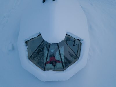 The cabin is heated and very pleasant. Let’s just say that after putting on all your hot clothes, before leaving the cabin, you feel like you’re about to faint. The cabin has a twin bed, two dressers with drawers for equipment, a kettle with cups and a bathroom (The hot water lasts for 10 minutes, then you have to wait for them to heat up again, so don’t plan on any long showers). Otherwise, the feeling you get, seeing the snowy trees and the bright sky while laying on the bed is hard to put into words.