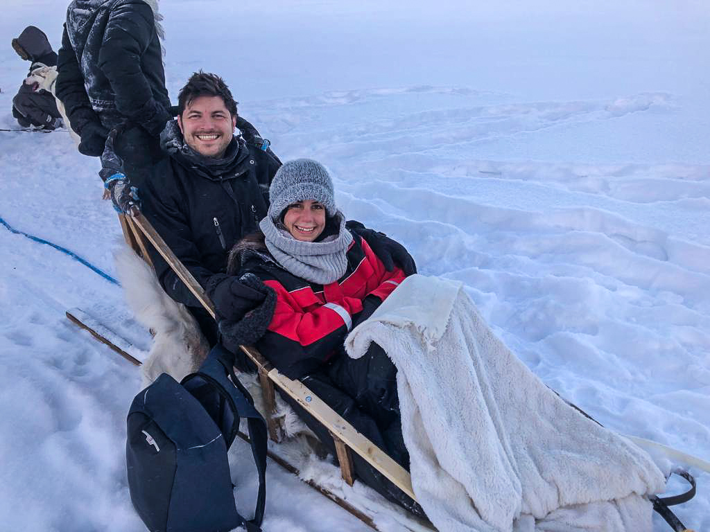 The place where the Husky dogs are located is relatively far from the cabins and we drove there in about 20 minutes. We were with another, Australian couple. When we got to the dog farm, they ran straight to us and jumped on us and were really cute. We and the other couple split into two sleds. In our sled, I sat while Roman stood in the back as the driver and in the second sled the couple both sat.