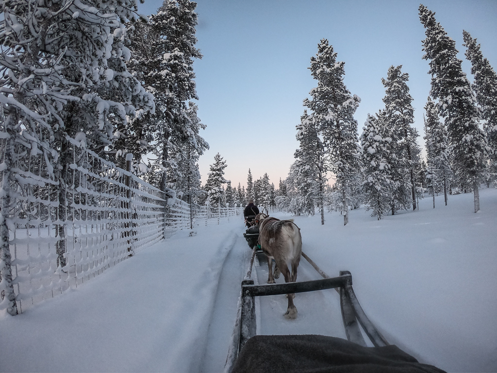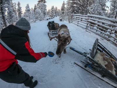 The reception has a screen where you can see all the attractions there are every day, which also indicates how many people are listed for each attraction. You need to arrive a quarter hour early for every attraction and wait for pickup at the reception desk (except for the husky dog experience for which you need to arrive half an hour in advance). It turns out the two of us were the only one to sign up for this attraction that day. We waited at reception and a nice man came and took us to the sleds with the reindeer. According to him, the speed of the reindeer can reach 55 miles per hour, but they carried us at a brisk walk, so this attraction is suitable for any age.