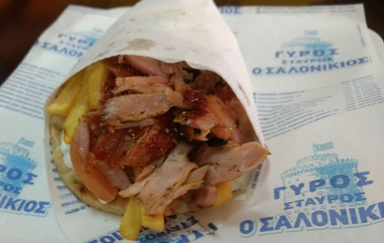 Itโs one of the best gyros I ate in Cyprus. You can order it in a small or large pita bread or on a plate. Itโs served with vegetables, yogurt and French fries. I chose the chicken, and Roman (my husband) ordered the pork. Both were good but I think the chicken was more special and was spiced well. The cost was 5 euro for a small Pita (which is actually pretty big) and 6 euro for a large pita