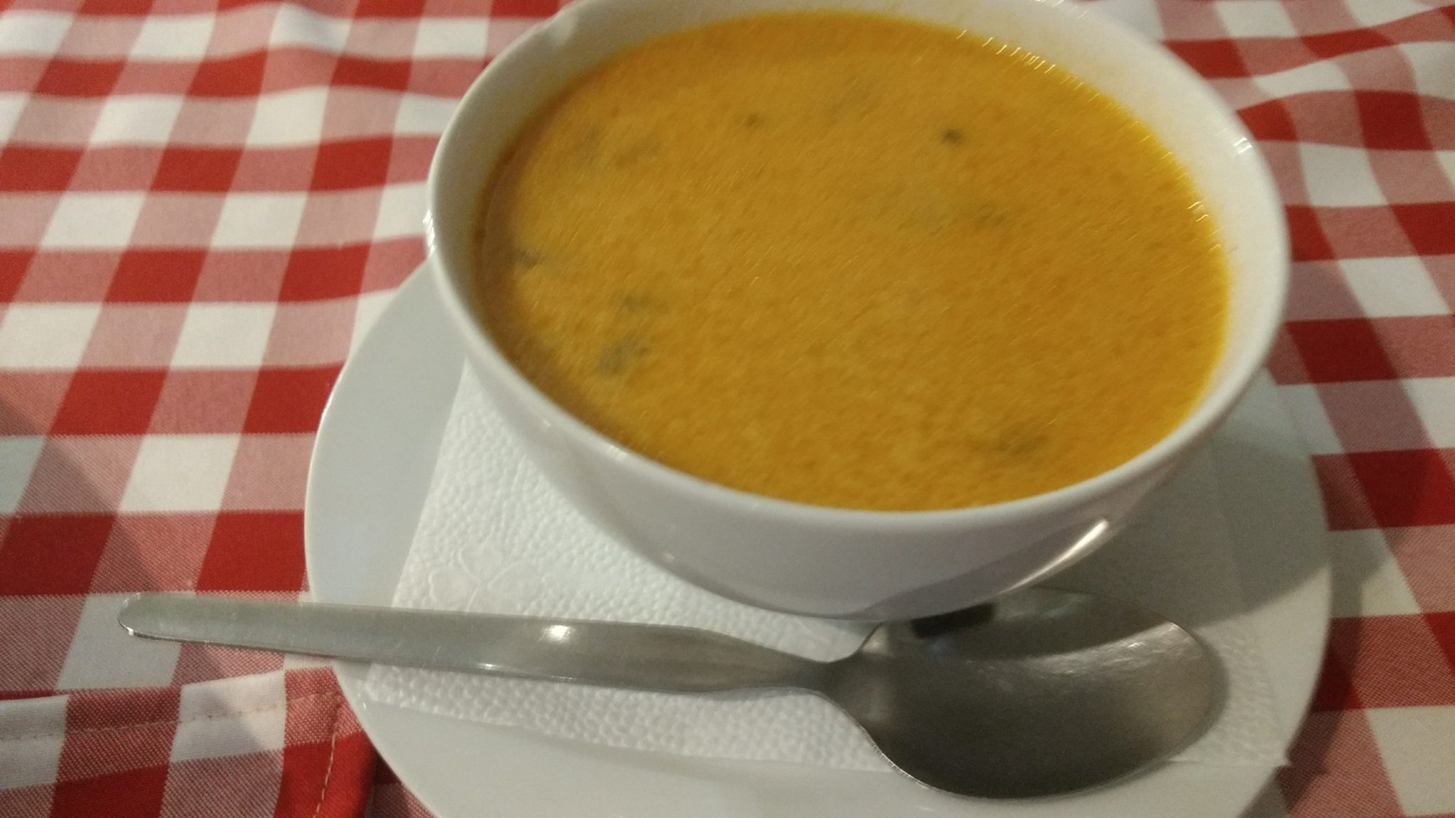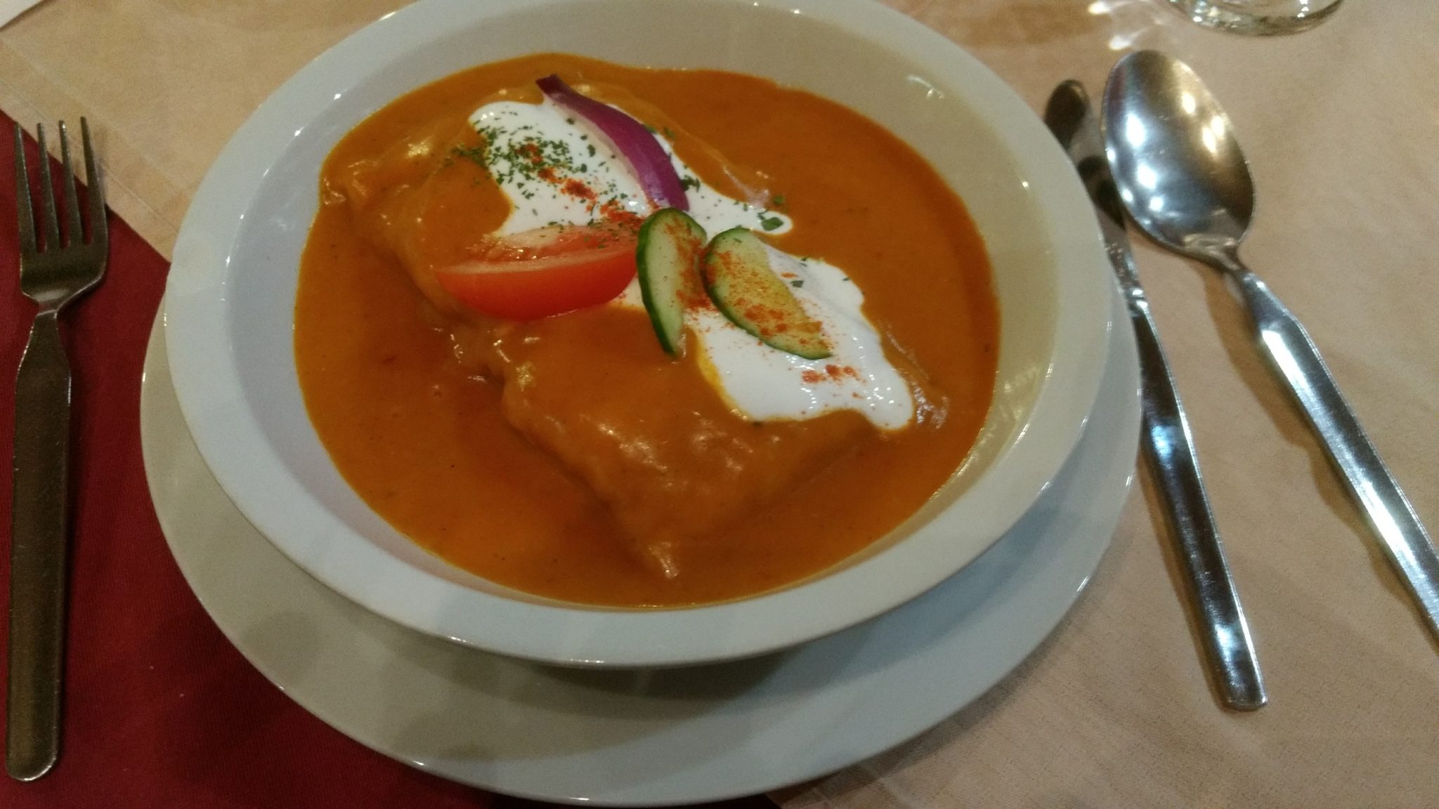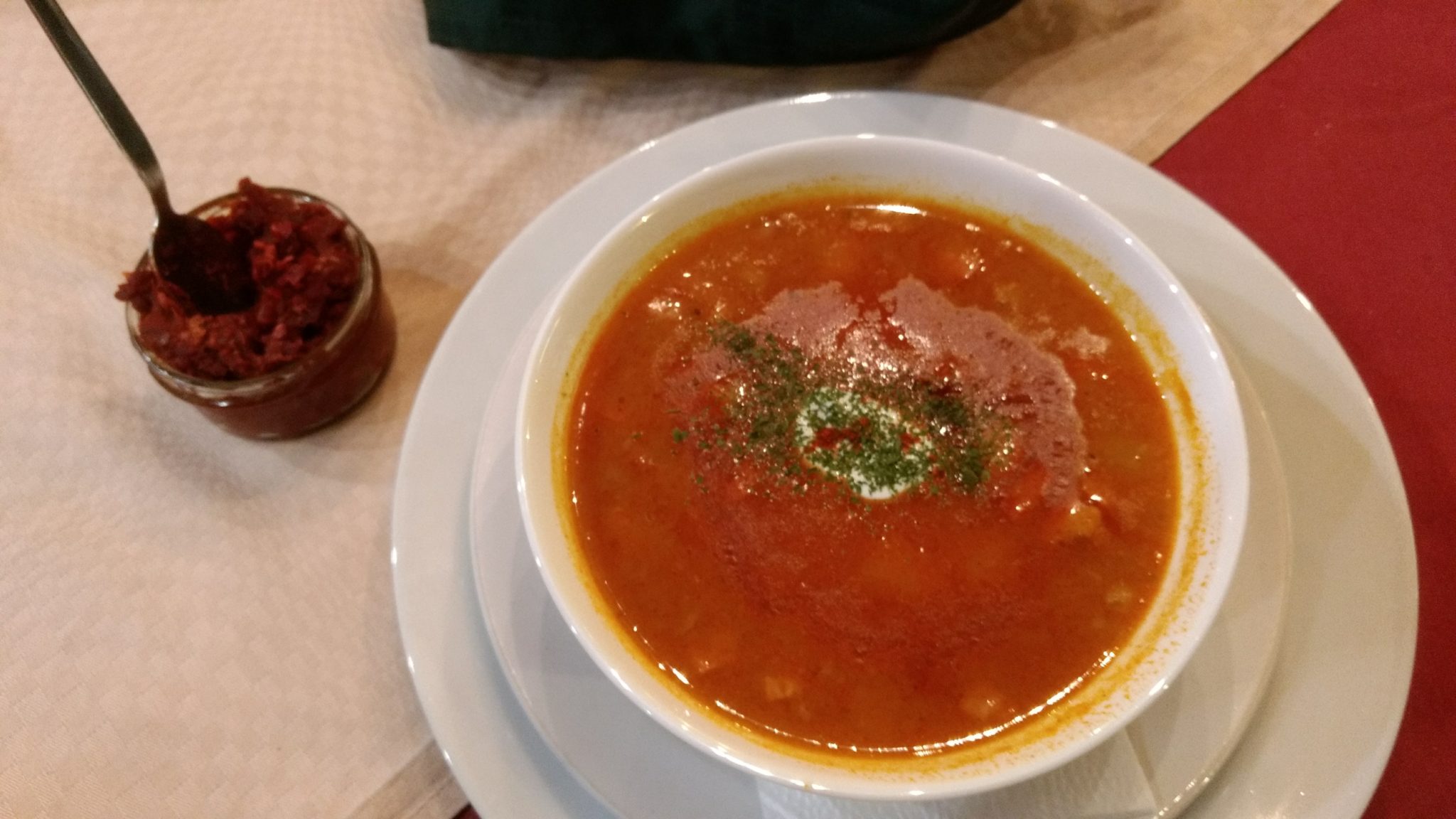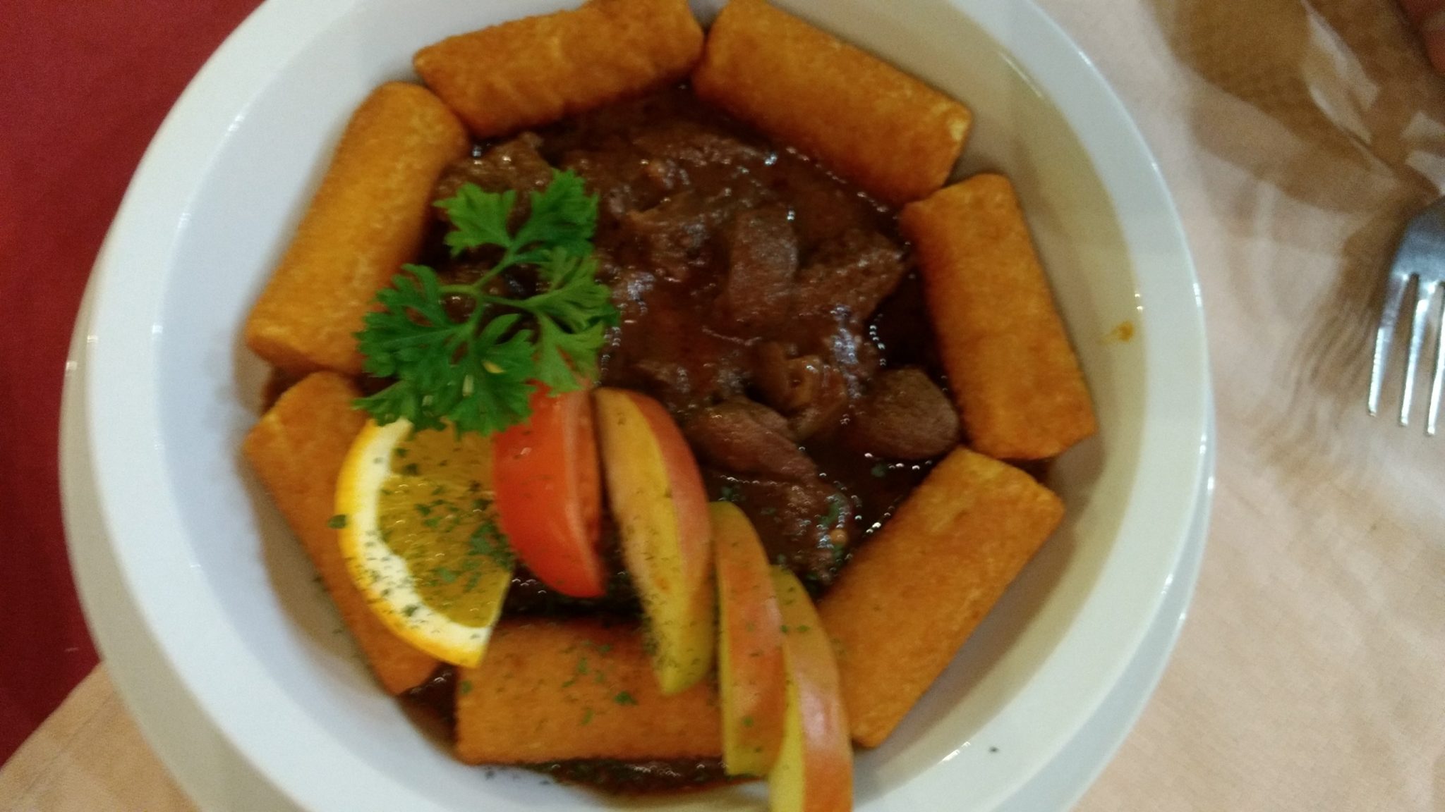 The restaurant is cozy and intimate with a varied menu of local dishes. The atmosphere and the food were great. We took a mushroom soup and goulash dish. They were very good and filling.