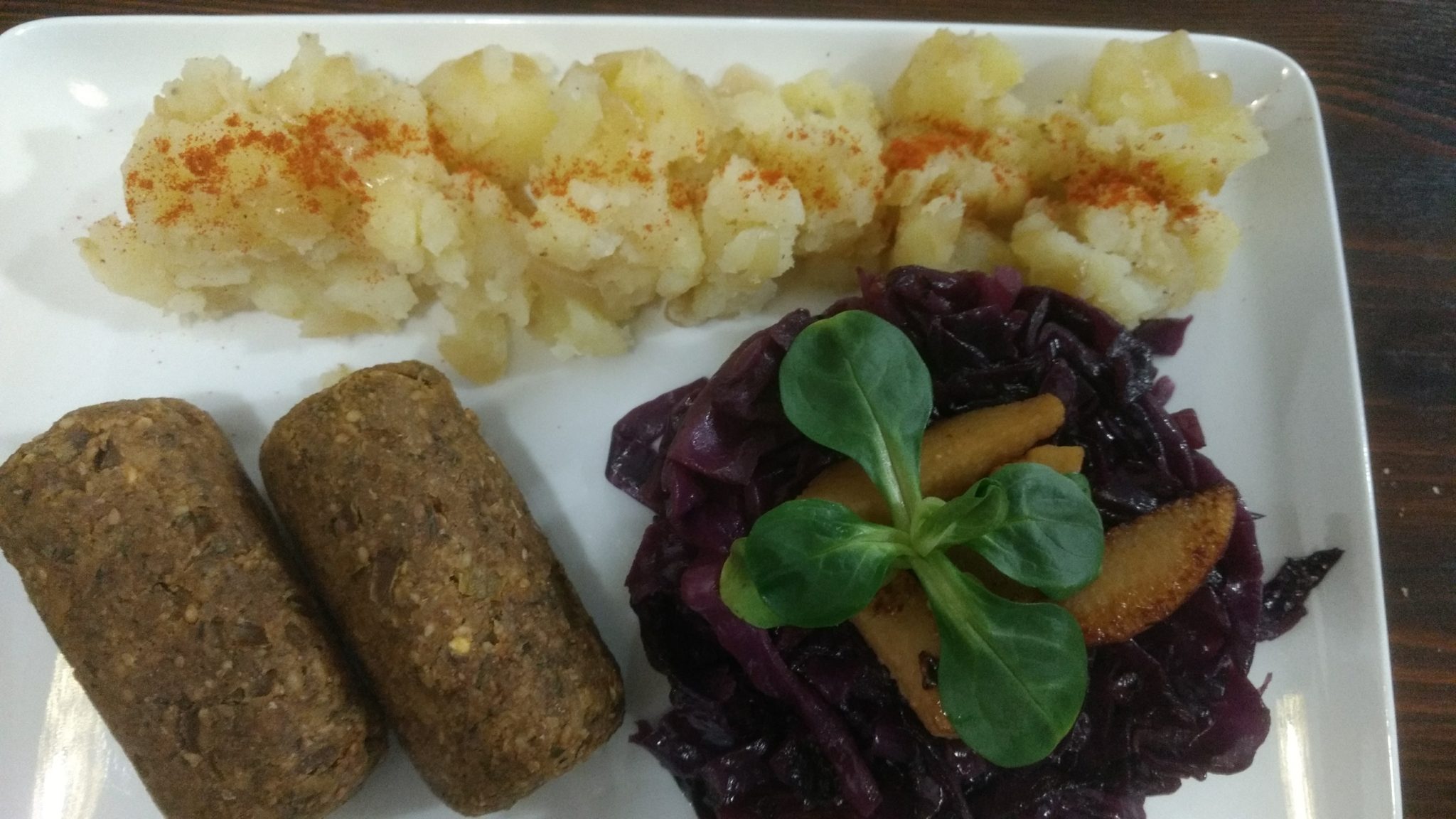 We ordered a green shake that was very cheap and it was so refreshing. As a starter we ordered hazelnut soup (we shared it) that was creamy and with dedicated tastes. For our main dishes we chose a vegan sausage made from nuts that was served with a potato and cabbage salad on the side.