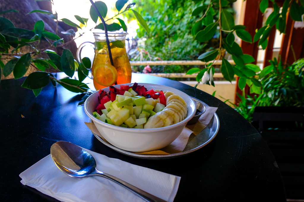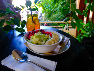 I looked at the menu and there were many dishes which seemed good to me, but in the end I decided to start with a coffee and for food I chose Quaker oatmeal with fruits and granola (Description of the dish as it appears on the menu: Quaker oatmeal – Vegan – Cooked in rice milk, rich granola and seasonal fruits, served with date honey). I love oatmeal as breakfast and this dish was great. I also loved the presentation and it had many fruits (Some places serve oatmeal with a couple of fruit chunks, which always bums me out as fruits are what make the oatmeal interesting in my opinion). I also ordered cold tea from an infusion which came in a cute jug and the tea was refreshing and perfect for a summer day.