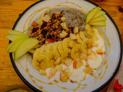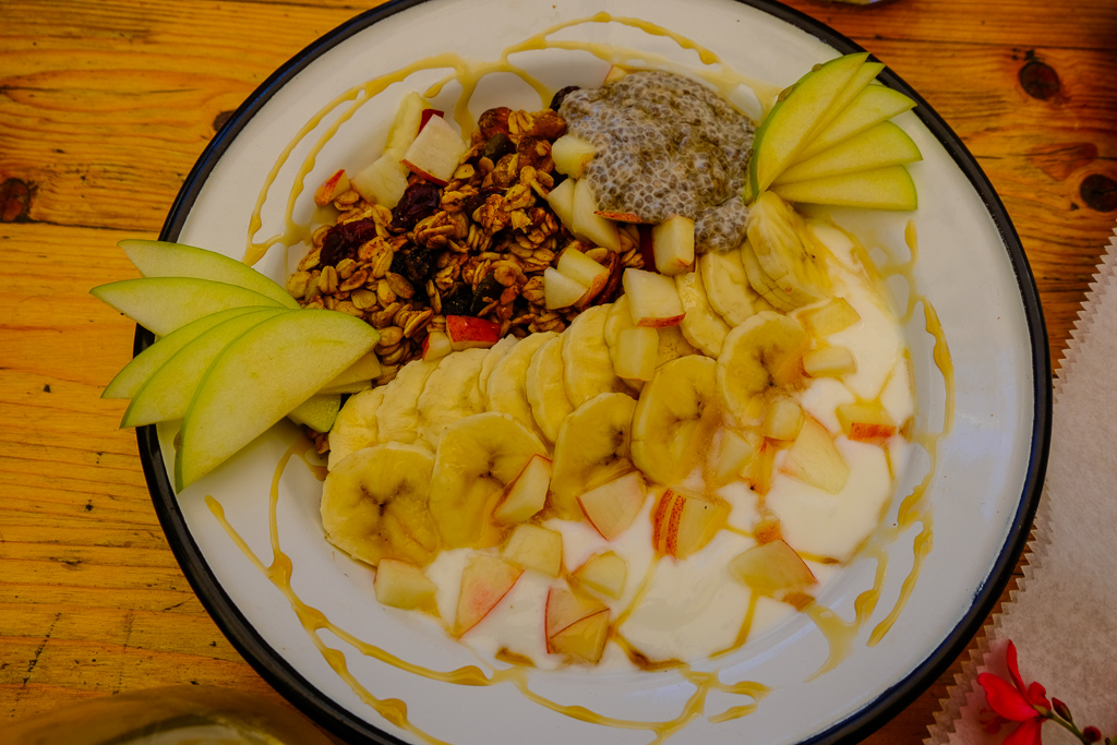 When I visited the cafe to write about it, I decided to try the vegan banana bread (Served with some whipped cream or cashew cream), Home-made muesli with granola, chia pudding with coconut and fruits and the bagel with fried egg, cream cheese, yellow cheese and caramelized onion. Of course, I didn’t miss out on the coffee (I ordered cold coffee) and kombucha (I discovered this drink in Thailand, it’s a fermented tea and one of the healthiest beverages you can find. If you’ve never had it, you have to try).