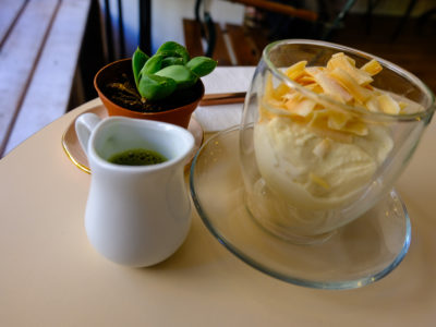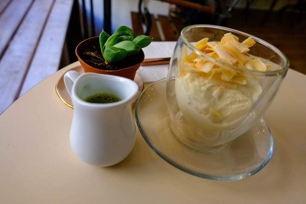 For dessert I got a new dessert which wasn’t even on the menu yet, ice-cream with coconut chips and matcha sauce (Thinly ground green tea, adored in Japan). I’m not usually a fan of sweets, but this was a light dessert with delicate and unique flavors (Good for matcha lovers).There’s seating inside and out.