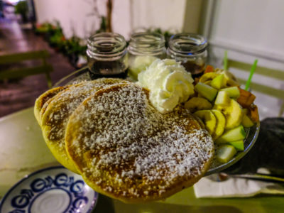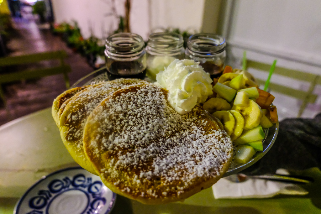 Finally, we were served coffee and a dessert of pancakes with fruit, whipped cream, maple syrup and chocolate. We’re aren’t usually big fans of desserts, but the pancakes were thin and not sweet – We honestly really liked this dish. Despite this being a café, it’s apparently a great place to come to after work for a cocktail.