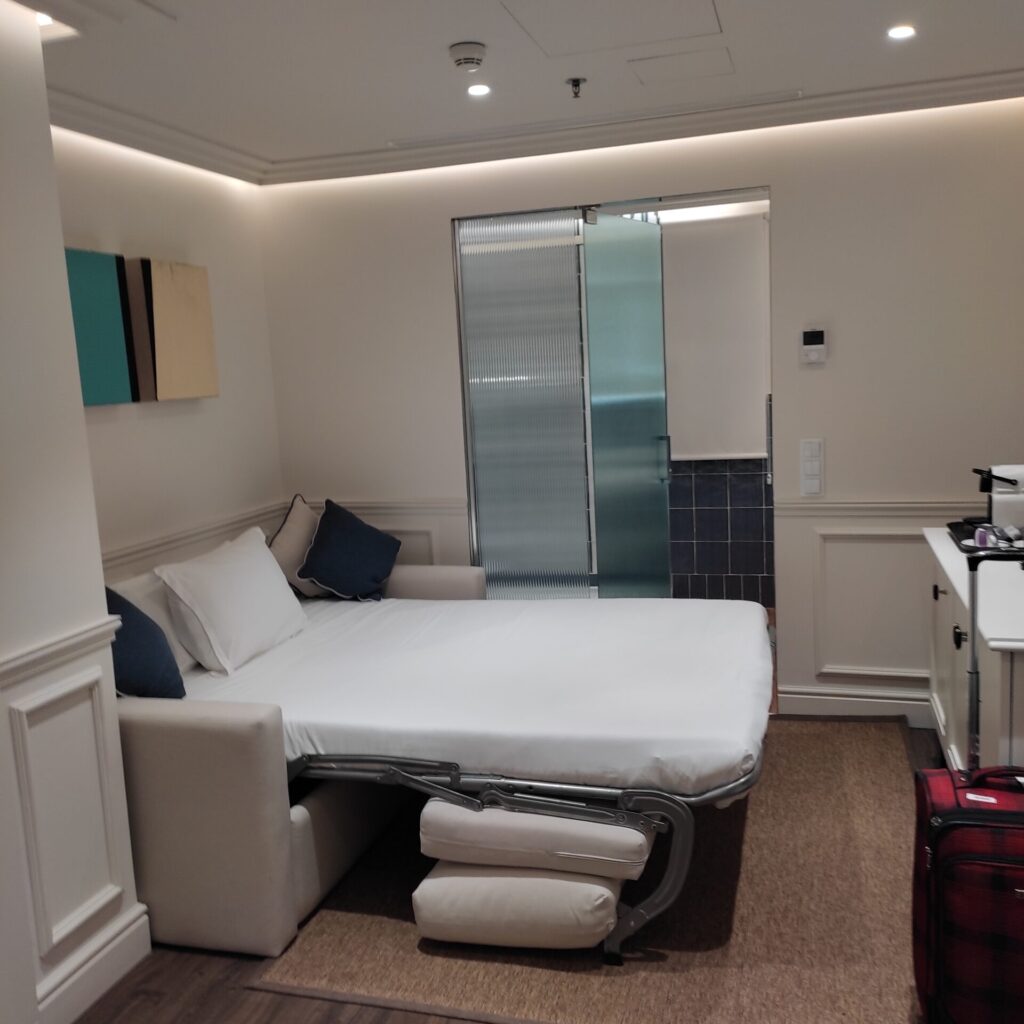 I stayed at this hotel on a solo trip prior to a cruise. Due to some problems with the reservation, I got a free upgrade to a Junior Suite – an unexpected splurge. The Junior Suite offered a sleeping area with a decent desk, a pull-out couch, and a stylish and large bathroom. From the Juliette balcony I had a great city view!