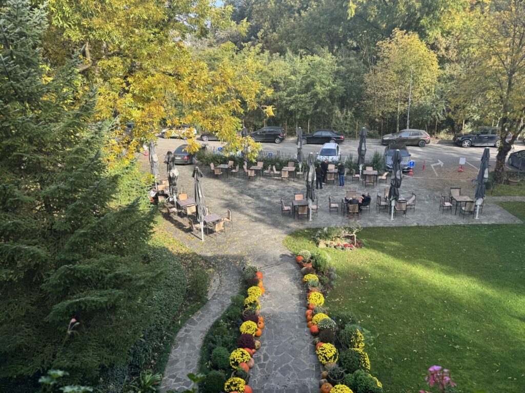 The rooms are basic but spacious and comfortable, with comfortable beds. We booked two rooms next to each other (there are no connecting rooms). The cost was €70 per room per night, including a simple buffet breakfast, and the rooms have balconies overlooking the park. This hotel also does not have an elevator, only stairs, with a restaurant on the first floor and three additional floors of rooms.