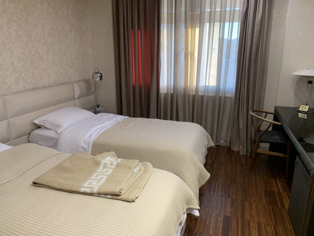 The beds are very comfortable, and the windows have shutters that allow the room to be completely dark. The room is small but functional. The shower is less convenient because there isn’t a wide enough door, so water splashes everywhere. Another important detail: there is no elevator in the hotel, but it’s only one floor up and one floor down.