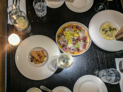 For starters we were served Mackerel, then a tartar. For mains we got a fish dish and dessert was pumpkin Brule. Of course, we also ordered white wine.