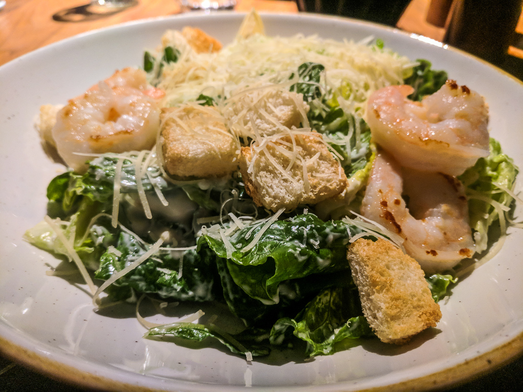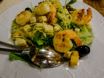 It’s recommended to book a table in advance, as the restaurant is on the small side and has high demand on a game night. We decided to have a light meal there, I had carpaccio for a starter which was very good, and Michal ordered Salmon skewers. For mains, I had Caesar salad with shrimp and Michal had a salad combining fruits and vegetables.