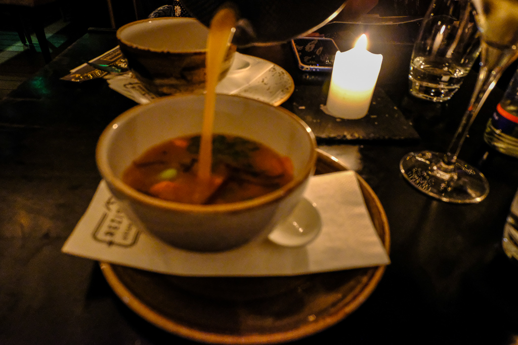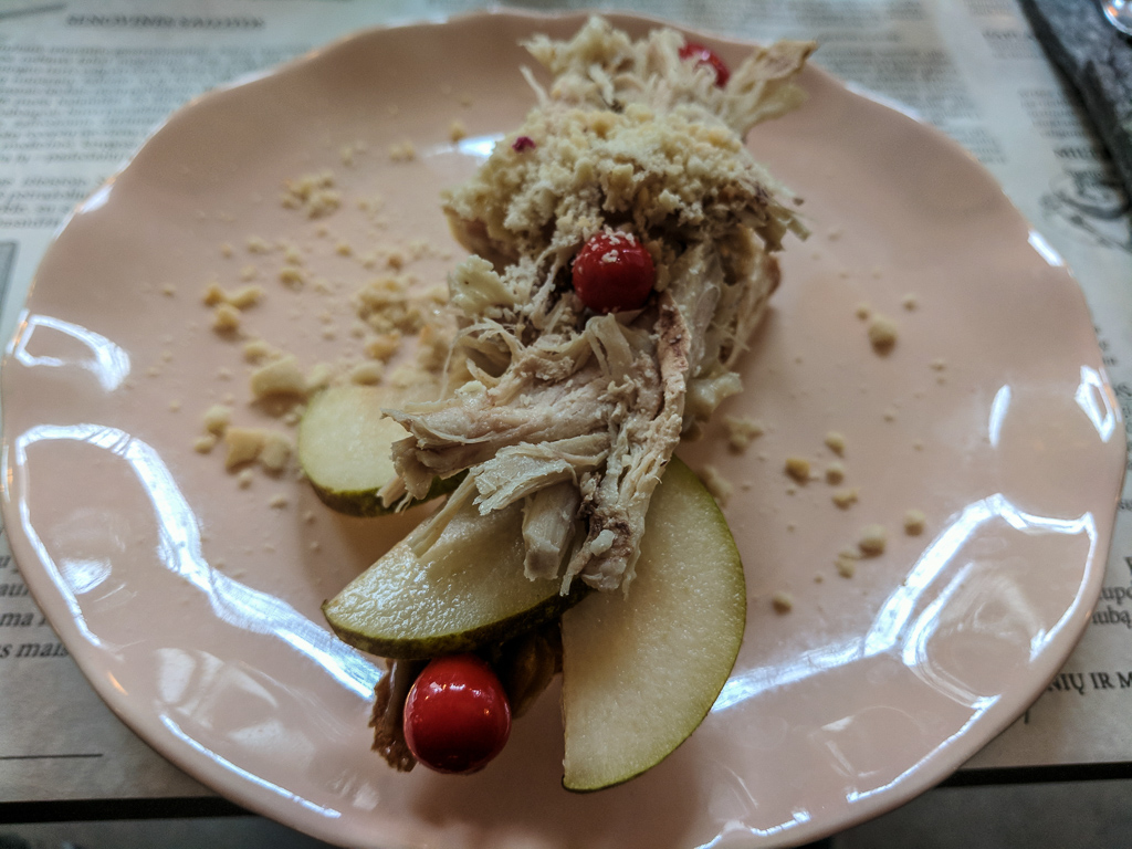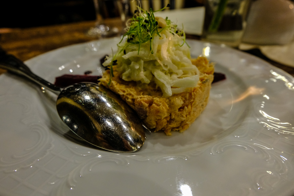 We reached the restaurant during lunch, with me, Michal and our guide, Linas. This one is also kind of a gourmet restaurant, with only a few tables. We were given a rigid menu from which we could choose between sweet potato soup and beef tartar for a starter. The mains were either a meat or fish dish. Then there was dessert.