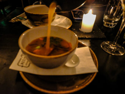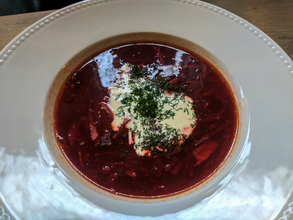 I ordered a starter of bread and chicken, mayonnaise and pears. A fun, light starter to get the meal going. I also ordered small toasts with a spread that I’m still not entirely sure what it was made of, but it was a kind of Pâté – they were great too. Michal ordered Borscht soup and liked it a lot.
