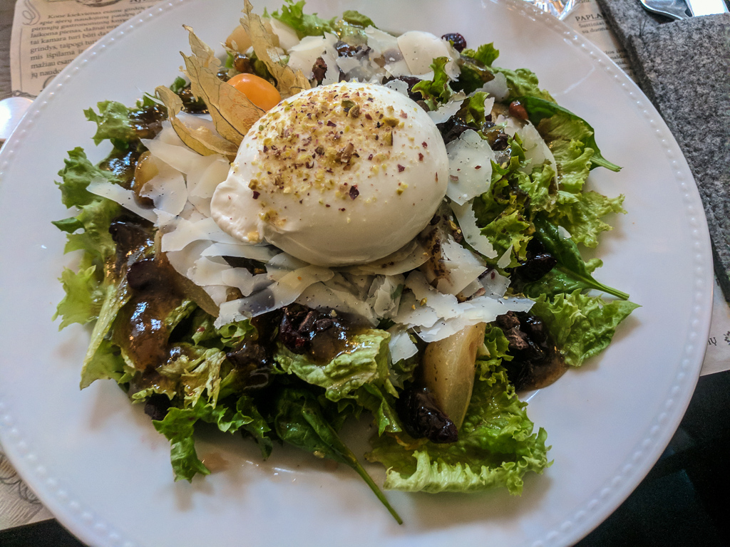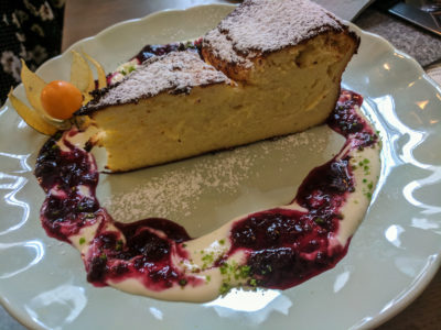 For mains I had a salad with cranberries and cheese, while Michal had a type of cake considered a main dish and made of the local cheese (It thus looked and, honestly, tasted like a kind of cheesecake). These dishes were good as well, and Michal’s was a bit like dessert, so if you’re looking for something more savory, you may want to try another dish.