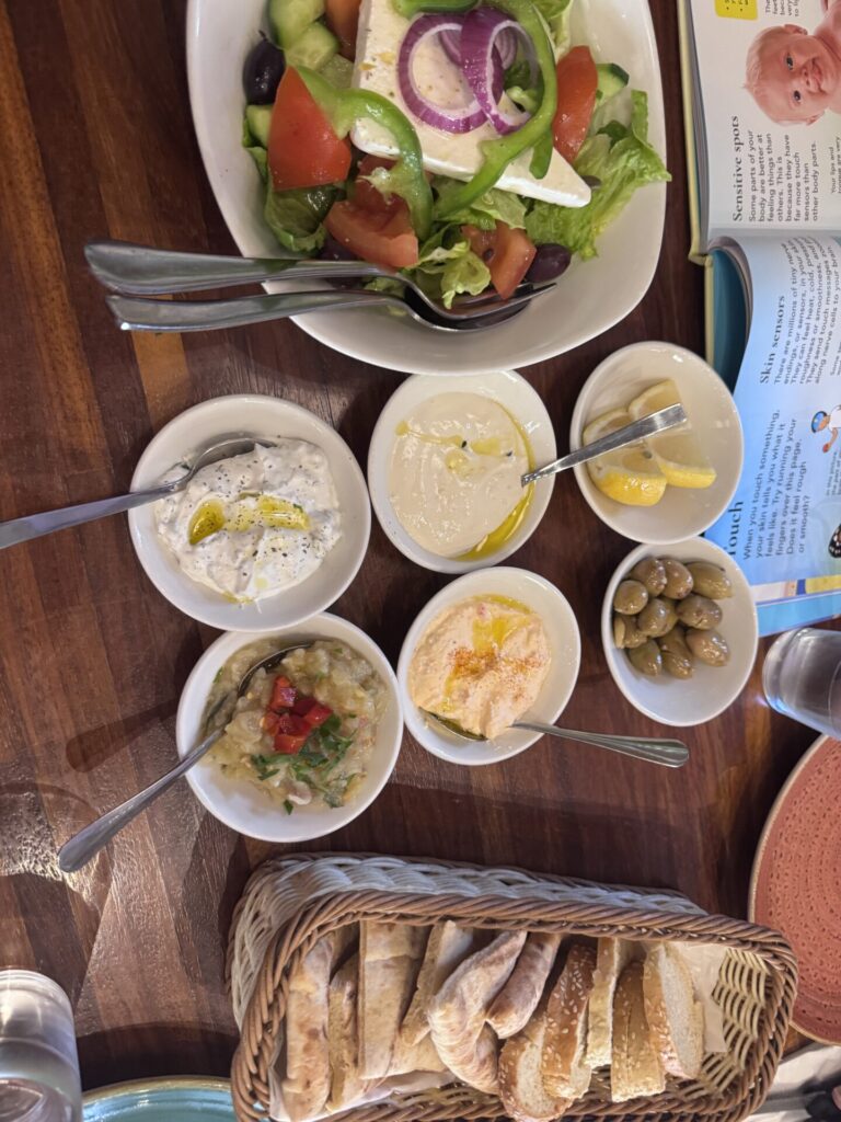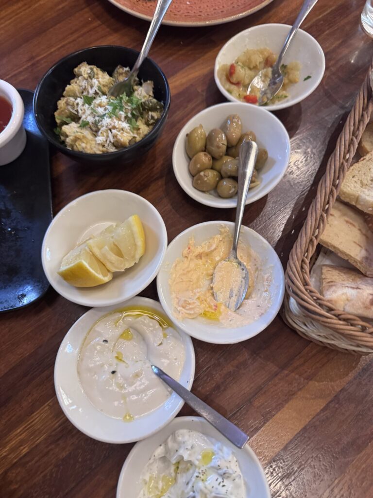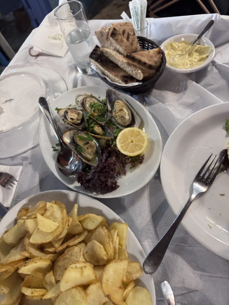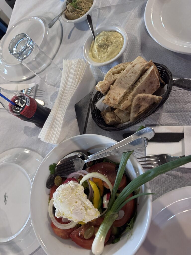 We ordered a grilled fish dish that was one of the tastiest I’ve ever eaten and for a really low price of 14 euros including a starter of Greek salad, hummus spread, tahini, tzatziki and olives.