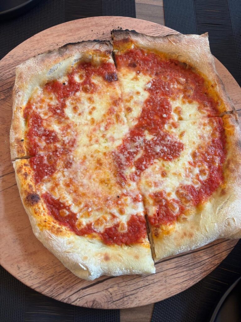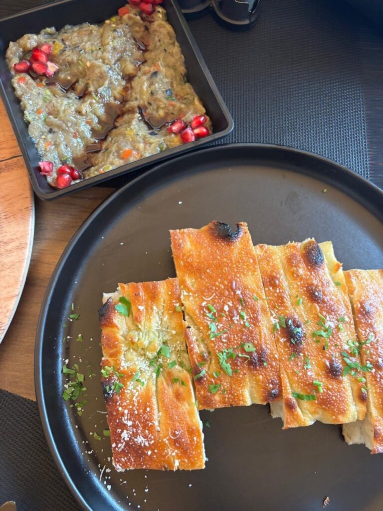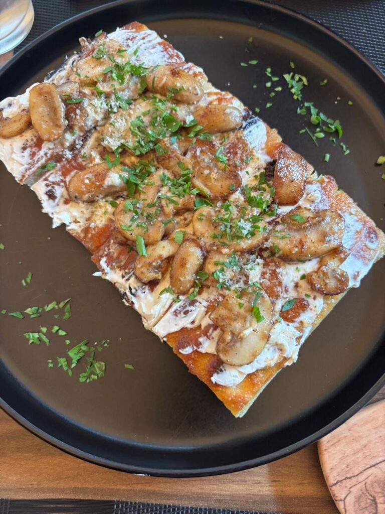 During our visit, we ordered a mushroom and mascarpone focaccia, which was especially tasty, a baba ghanoush starter served with regular focaccia, a Margherita pizza, and a brisket meat dish. The menu includes a wide variety of starters, specialty pizzas, burgers, and meat dishes. Recommended to try Dine 3.6.9.