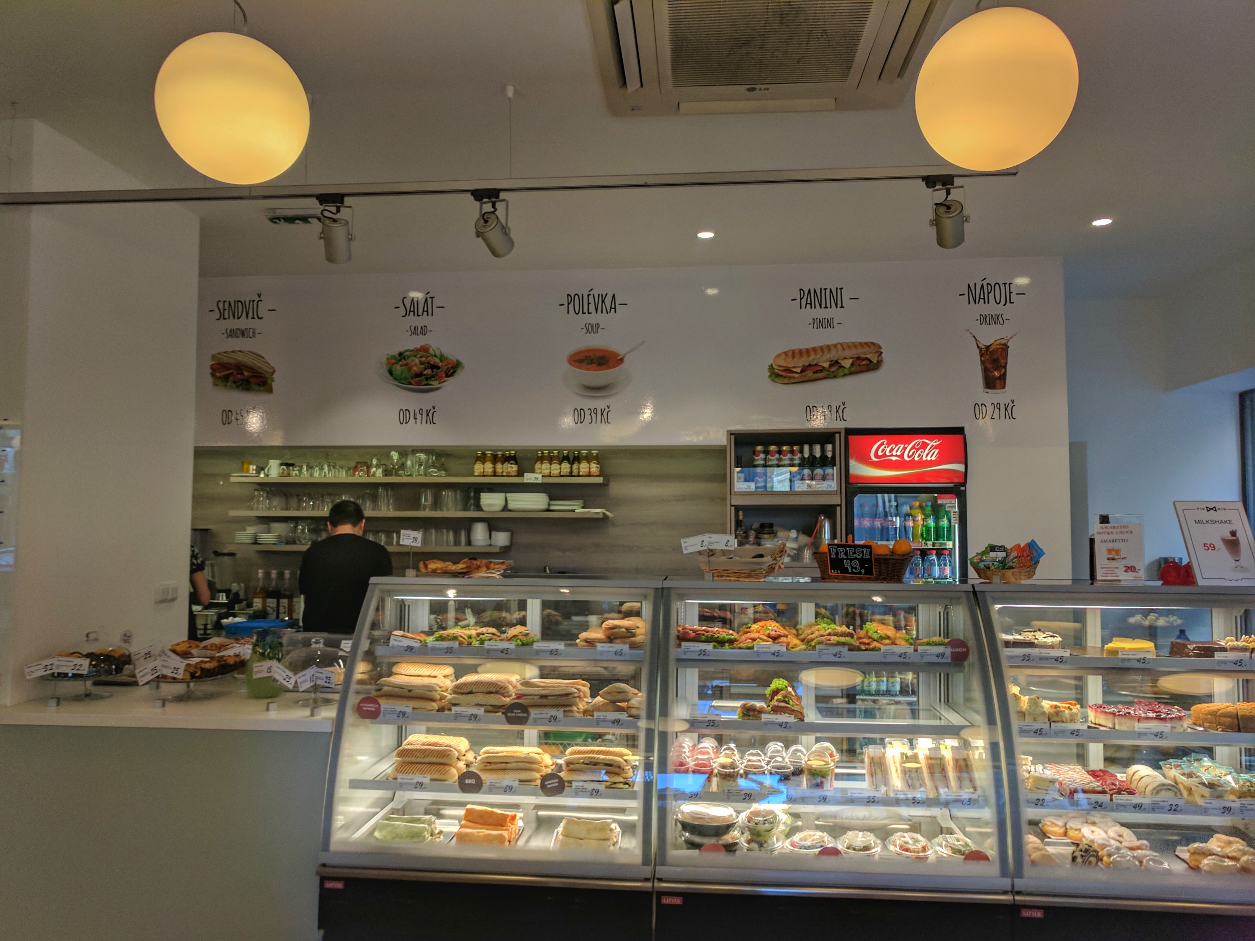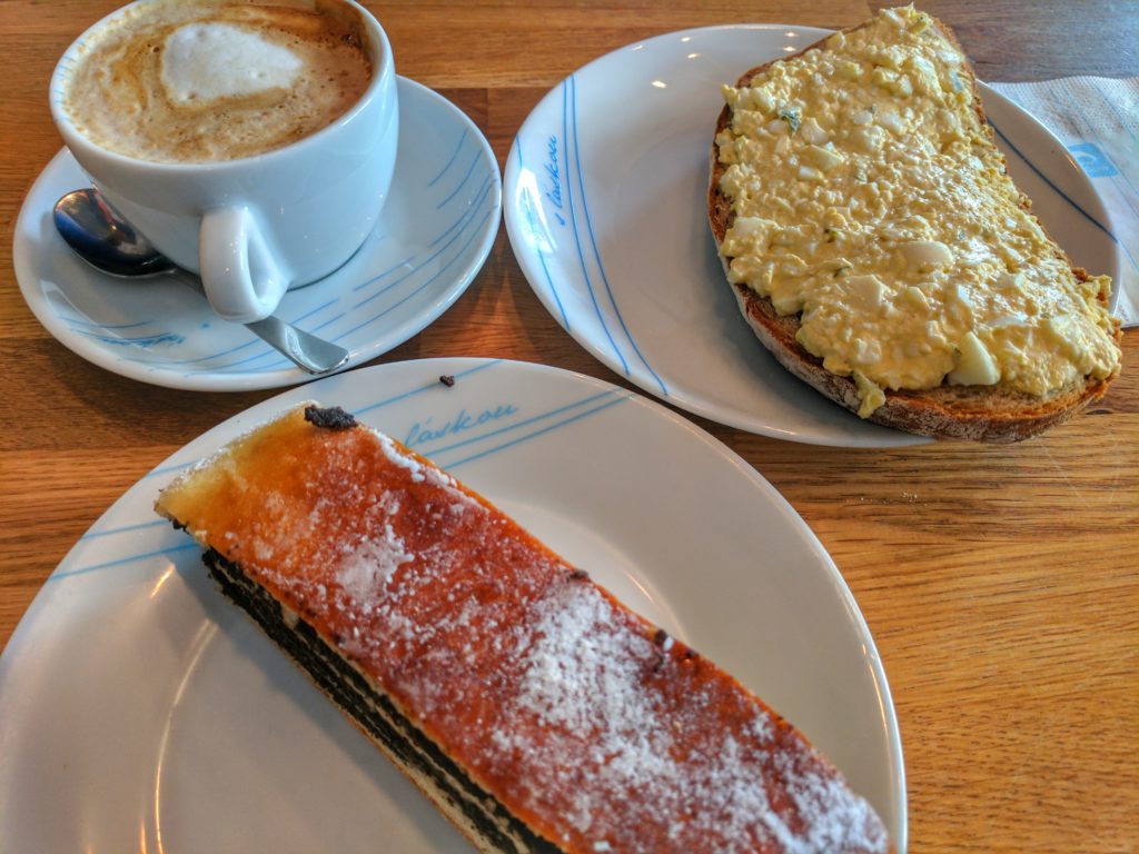 They have a large variety of fresh and delicious pastries. We had breakfast there on our first morning in Prague – I had a yeast cheese cake and a croissant and Roman had bread with egg salad and a poppy cake. Everything was really good. The prices were low, and so you might have to wait in line as the place is very popular.