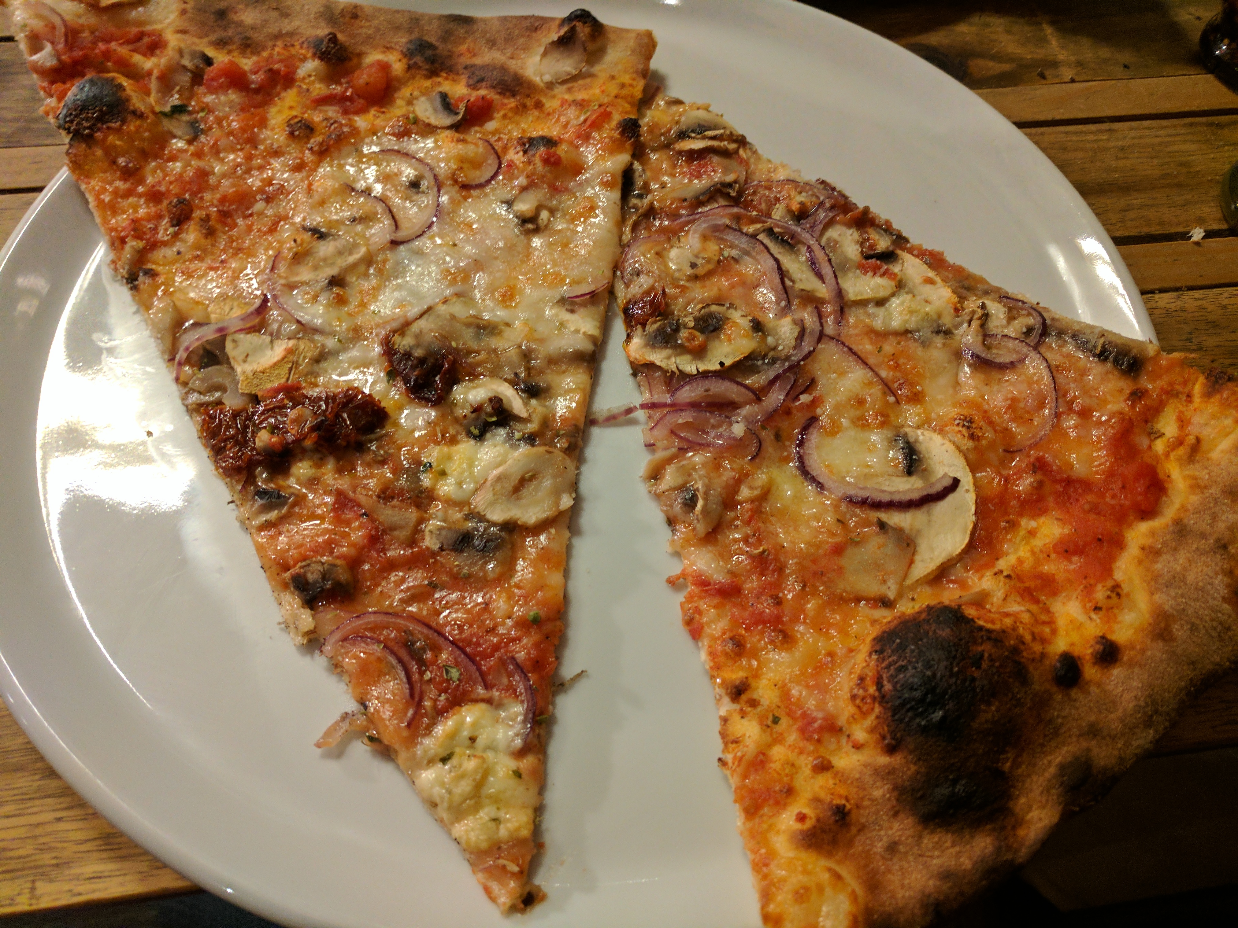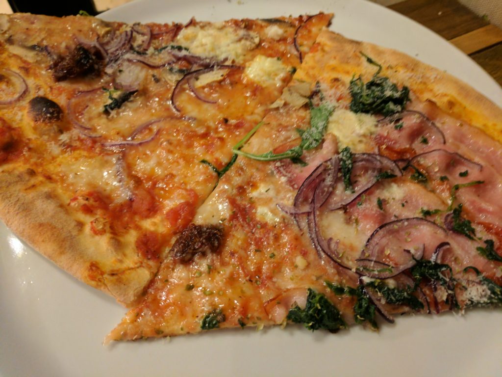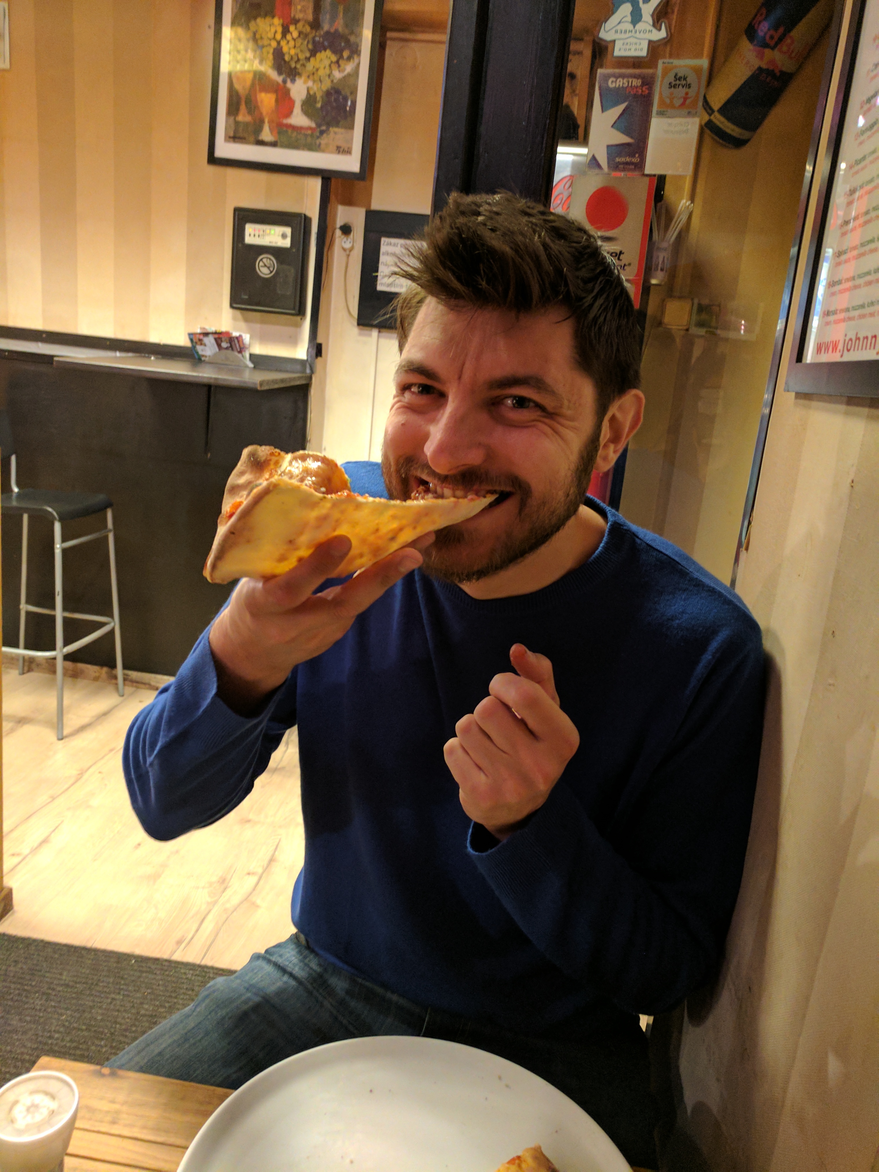 We arrived in Prague at 10:30PM and were really hungry. There weren’t many options around our Airbnb apartment so we decided to ride a retro to Johnny Pizza, which we saw was open. As we got there, the cook was pulling a fresh pizza out of the oven and we got two slices of it, each.