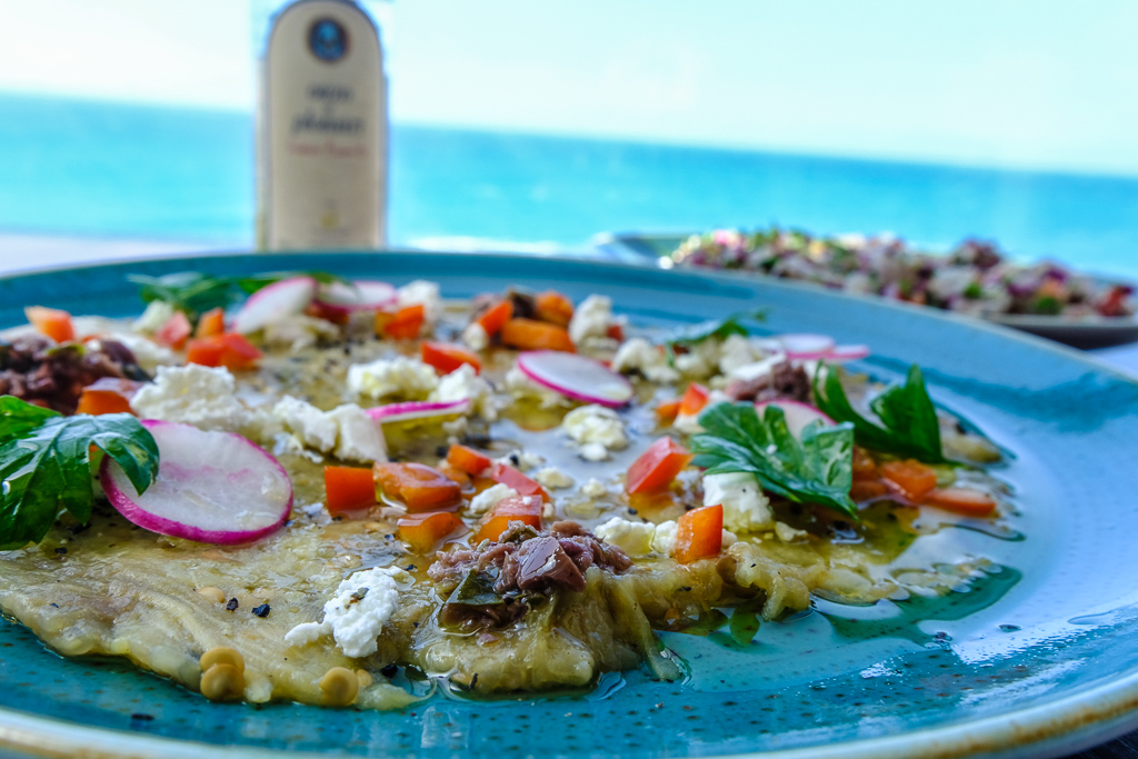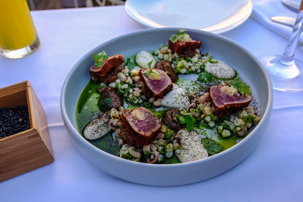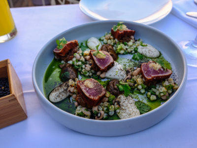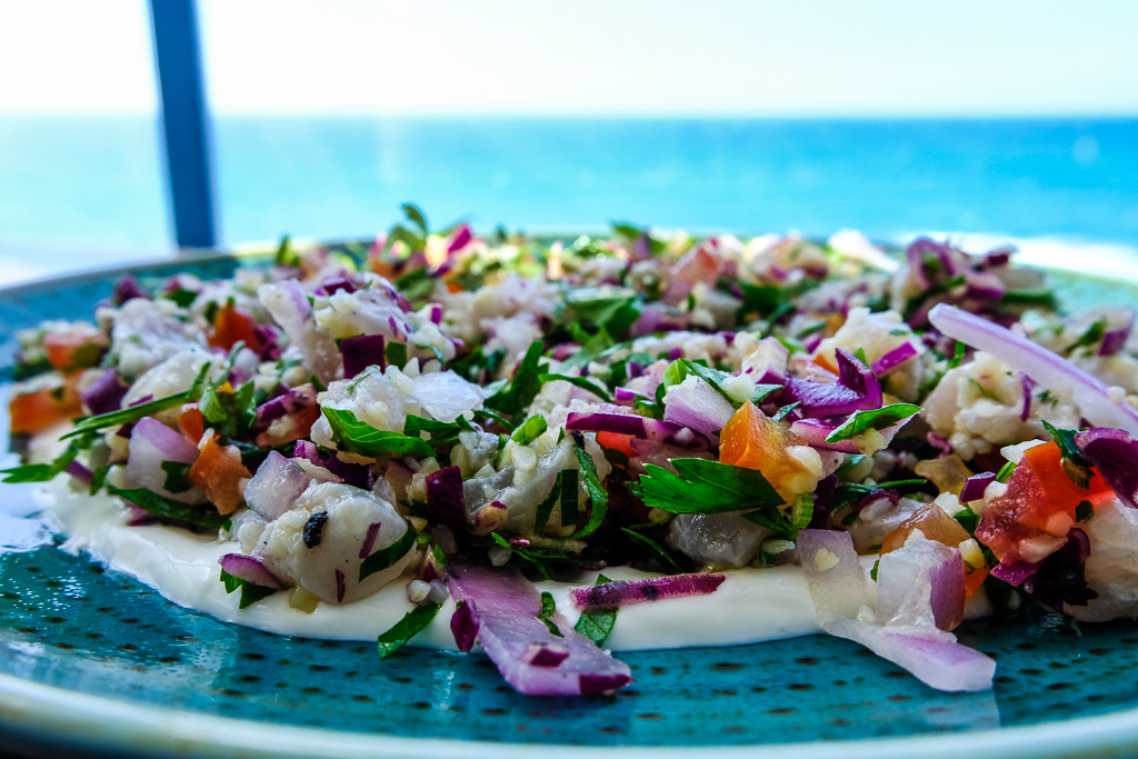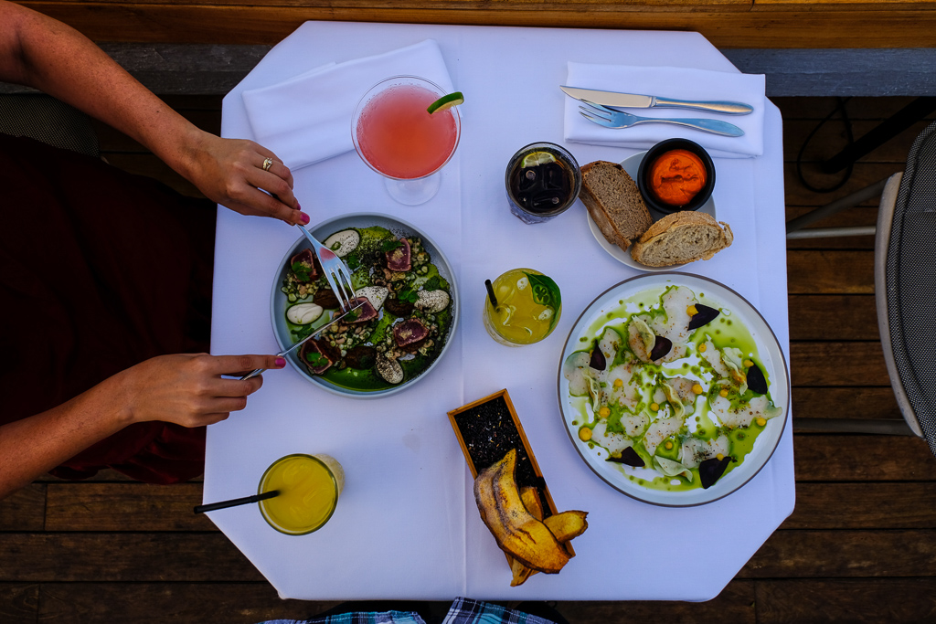 The second time I came on my own just for the blog and ordered the Baladi eggplant, Pâté, peppers, basil aioli and olive tapenade, the Arabian style drum fish ceviche and country bread and dips and of course a cocktail as well, Campari fizz, a shaken Campari with grapefruit vodka, gin, a touch of lychee, soda and mint flowers. This was a super fun and light meal. The combination of gorgeous view with the sour and bitter cocktail and the excellent starters was a real winner.