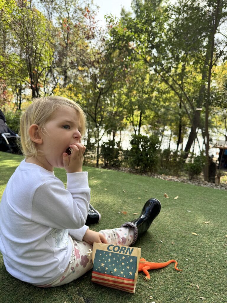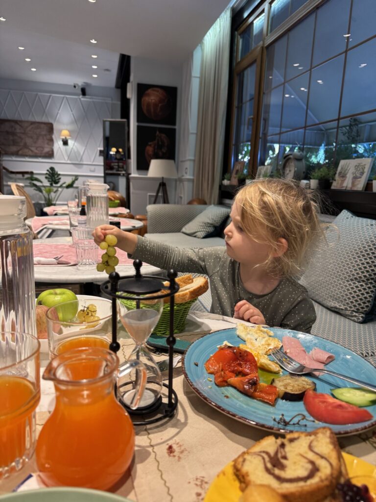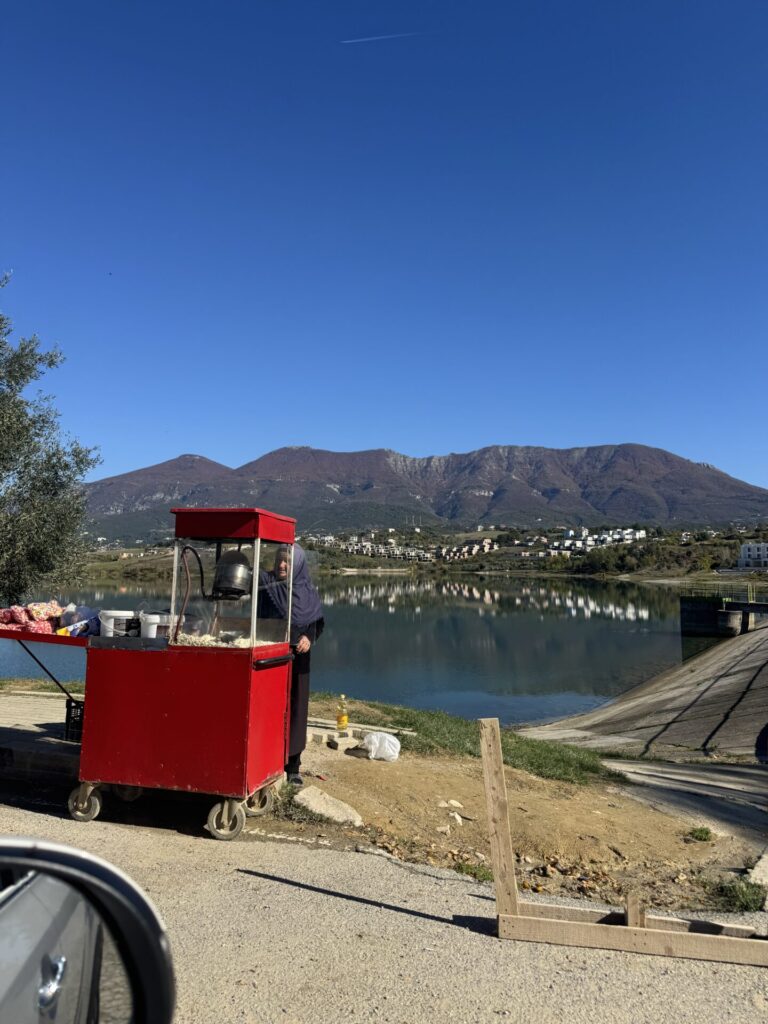 On our way back, we met an elderly woman selling popcorn. Maya ran straight to her. She bought a colorful popcorn bag for €1, and the woman gave us a plain one for free. Maya declared, “People in Albania are the nicest ever!”